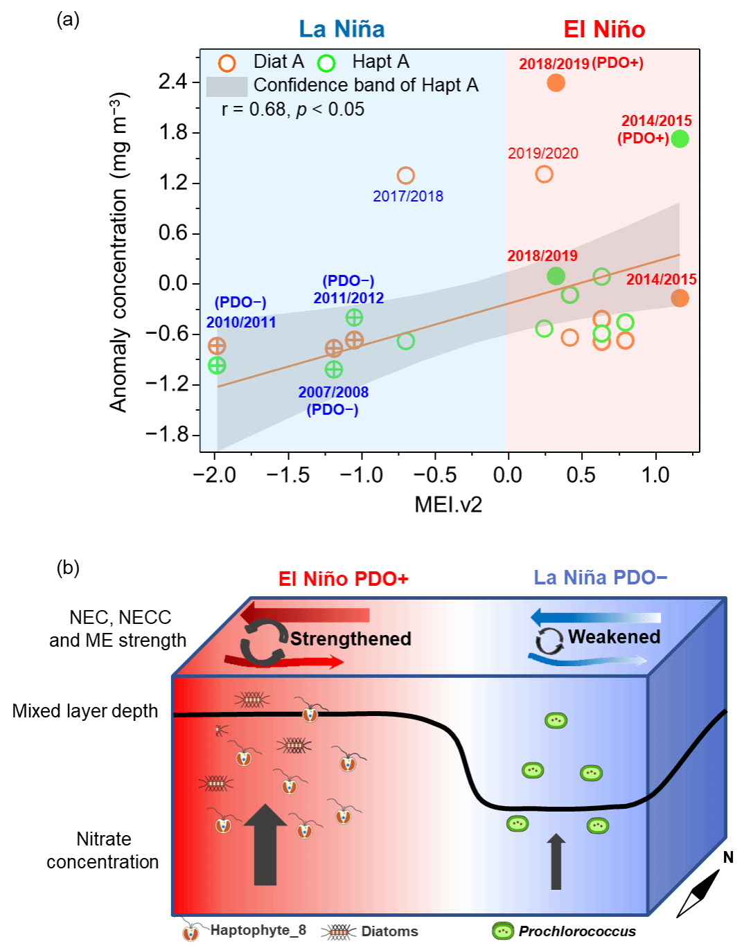 图1. ENSO驱动的赤道太平洋生物物理动力学相反变化