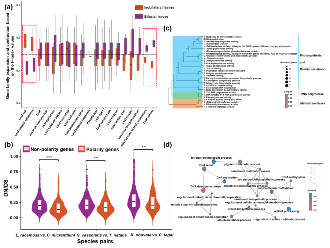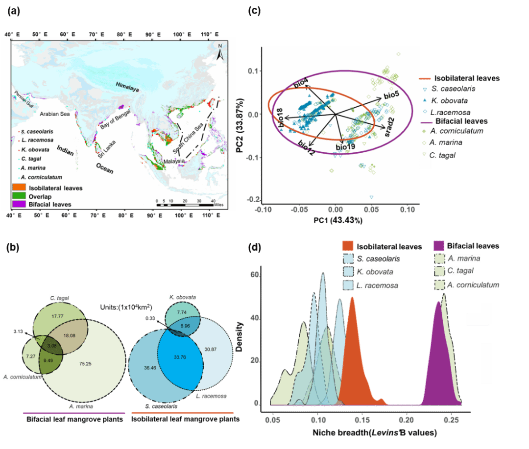 该研究聚焦于红树林物种中的等面叶特征,探讨其适应潮间带环境中的遗传基础、对红树的生态效应及响应环境变化的能力。研究结果表明,等面叶在多种不同科红树中共同出现是趋同进化的结果,其通过更高的叶片含水量和叶绿素含量促进植物光合作用以提供红树植物的局域适应优势。同时,这样的趋同特征具有趋同的遗传基础,包括与叶片背腹发育相关的基因家族存在趋同的收缩或扩张,光合作用和叶片极性发育相关通路受到了更强的选择压力。尽管如此,具有等面叶的红树植物通常占据较窄的生态位,并且在多种快速变化的环境情景预测下,其适宜栖息地面积进一步减少。研究表明,趋同性状虽然能够增强植物的局地适应性,但同时也可能增加其对持续环境变化的脆弱性。该研究为理解遗传适应与环境适应力之间的相互作用提供了宝贵的见解。
