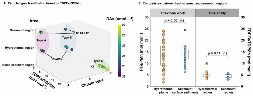 进一步分析表明,岛屿沉积物、热液和海山引发的As清除效应存在差异,主要受控于颗粒物组成和环境因子的变化,具体表现为:(1)岛屿沉积物主要输送陆源颗粒,富含铝成分,与其他两类海底系统的颗粒相比具有不同的Fe/Mn比值(图3A),从而产生不同的清除效应;(2)虽然热液和海山输送的颗粒物在Fe、Mn组成上无显著差异(图3B),但热液影响使得周围水体具有更高的温度、更低的pH及更强的还原性(表现为低溶解氧浓度),导致颗粒清除过程异于海山。