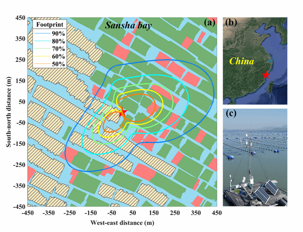 该研究在福建三沙湾大型海藻养殖区开展温室气体通量的原位高频连续观测(图1),首次获得大型海藻养殖区水气界面甲烷(CH4)通量的全年逐半小时连续观测数据,弥补了以往研究缺少高频通量观测数据的不足,揭示了CH4通量的多尺度时间变异规律及其环境控制机制,量化了CH4排放对大型海藻养殖区温室气体净辐射效应的贡献。此前,该团队已报道了同一站点的二氧化碳(CO2)通量特征,本研究进一步揭示CH4通量特征及其增温潜势,为评估大型海藻养殖区温室气体源汇动态及其气候效应提供了科学基础。