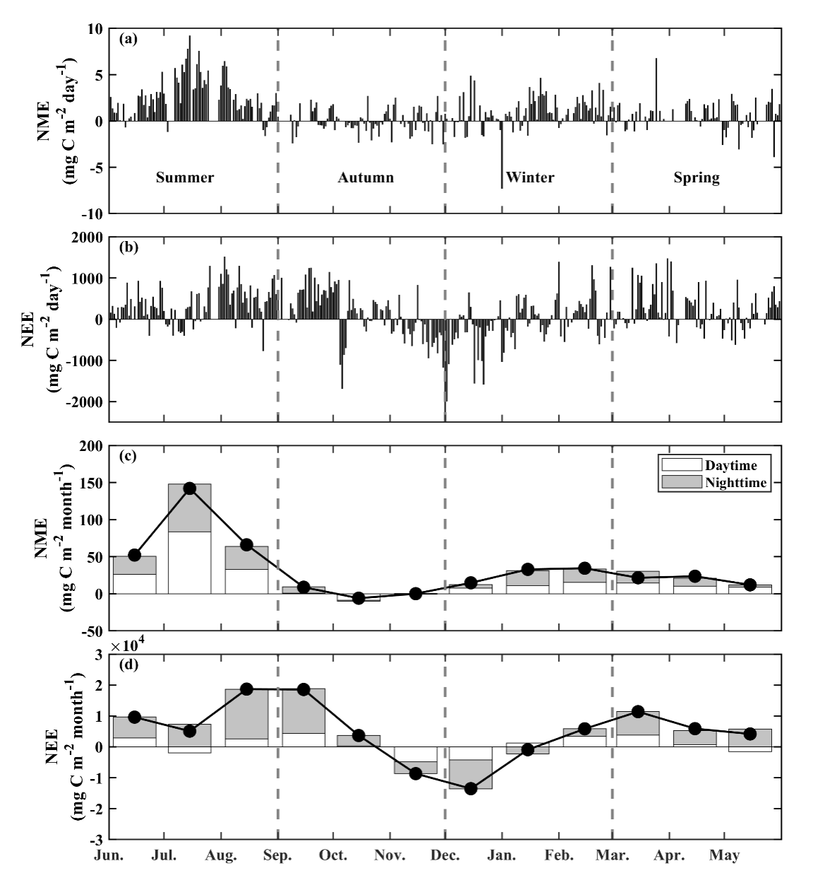 图2. 大型海藻养殖区CH4通量(NME)和CO2通量(NEE)多尺度时间变化