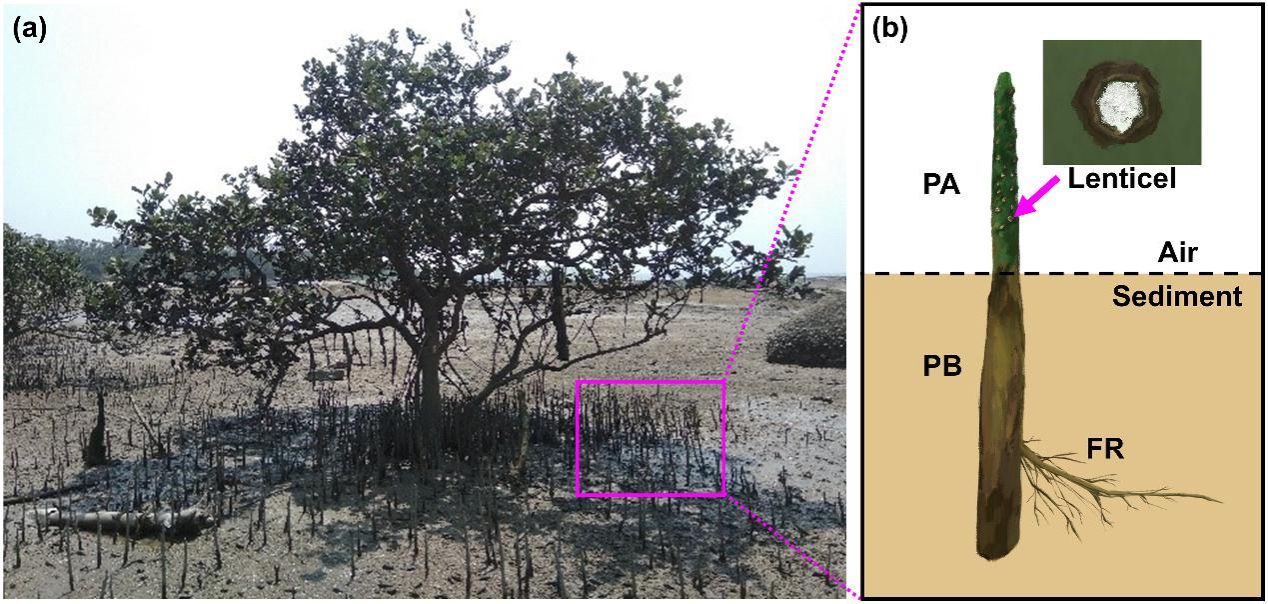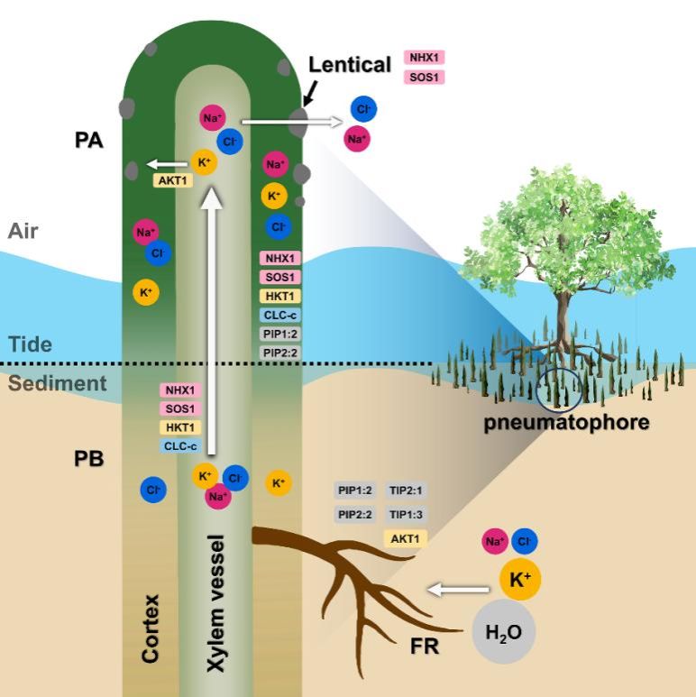 红树林是生长在热带和亚热带海岸潮间带区域的木本植物群落,为适应滨海湿地高浓度盐分、淤泥质缺氧及海浪冲击等严苛生境条件,红树植物通过形成多种多样的气生根来适应潮间带环境。白骨壤(Avicennia marina)作为红树林中的先锋物种,其水平走向的根(cable root)每隔一段形成露出沉积物表面的负向地性生长的指状呼吸根(pneumatophore)。已有研究表明,呼吸根的主要功能是协助植株在缺氧的潮汐水淹生境中获得氧气,而呼吸根表面的皮孔则被视为气体进出的通道。通常单独一株成年白骨壤树木拥有至少500-600个呼吸根,很多呼吸根分布在距植株主茎数米以外的位置,若所有呼吸根吸收积累的过量盐分均需经由主茎运输至地上部分,最终通过叶片上的盐腺外泌排出,不仅距离远、耗能高,且排盐效率低。