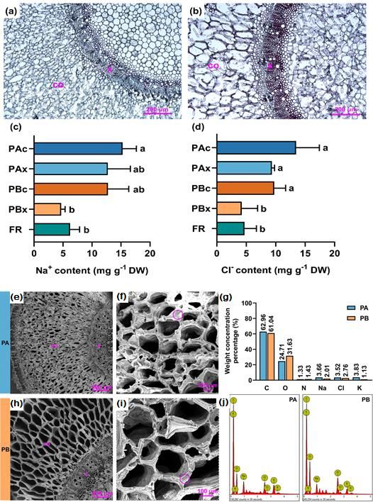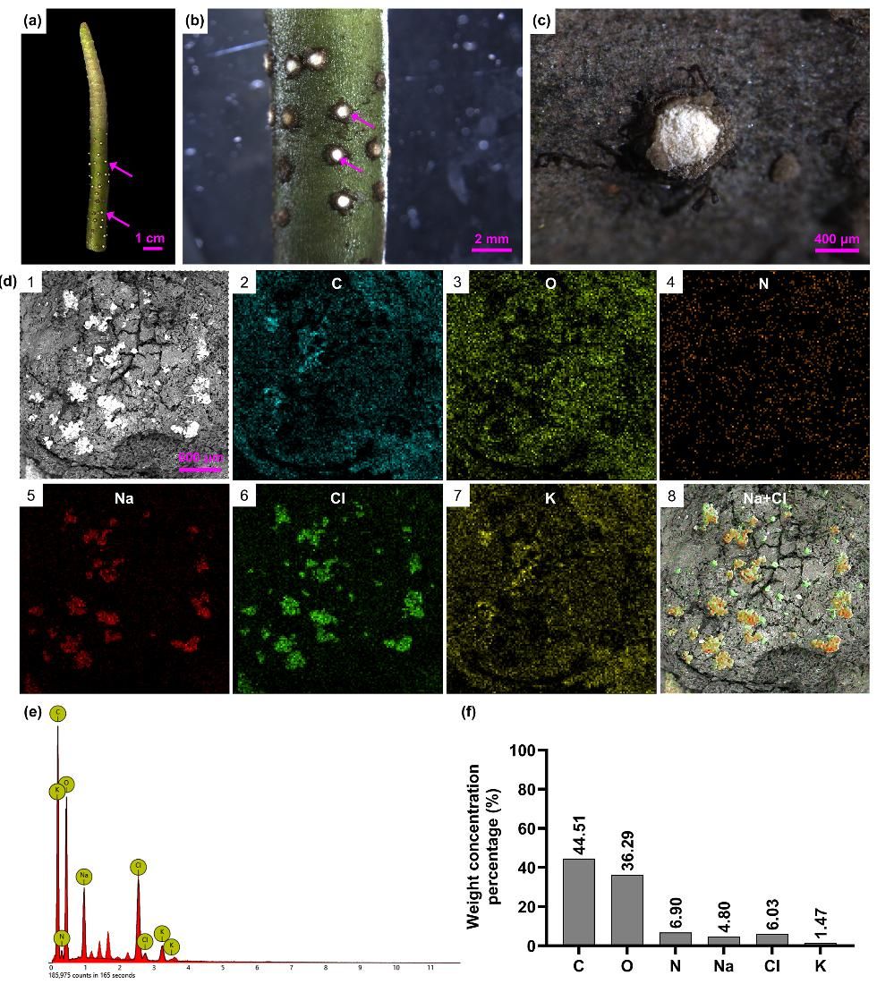 研究团队前期工作已证实,白骨壤呼吸根具有茎的解剖结构特征。鉴于茎维管束木质部负责将水分和无机盐从根部向上运输,在发现白骨壤呼吸根皮孔孔口处有白色结晶积累的现象时,研究团队推测:呼吸根可能在盐离子的吸收、转运和平衡中发挥重要作用,呼吸根中的过量盐分可能通过皮孔就近排出,从而有效缓解高盐环境对呼吸根组织造成的离子毒害,维持其正常的生理功能。