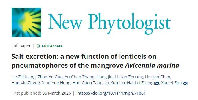 He-Zi Huang1§, Zhao-Yu Guo1§, Yu-Chen Zhang1, Liang Jin2, Li-Han Zhuang1, Lin-Jiao Chen3, Han-Xin Zheng1, Xing-Yue Hong1, Han-Chen Tang1, Jia-Kun Liu1, Hai-Lei Zheng1*, Xue-Yi Zhu1*. Salt excretion: A new function of lenticels on pneumatophores of the mangrove Avicennia marina. New Phytologist , 1-16, 2026.