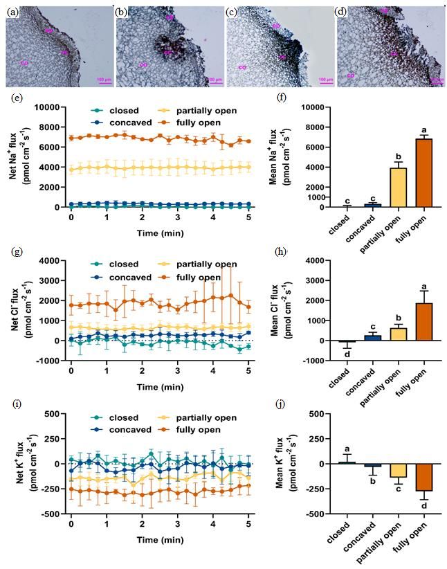 研究团队将白骨壤的呼吸根分为三个功能区(图1):暴露于沉积物之上且具有皮孔的地上部分(PA)、埋于沉积物中的地下部分(PB),以及生长在PB上、具有吸收养分和水分功能的营养根(FR)。扫描电镜结合能谱分析结果显示,皮孔处白色晶体中Na和Cl元素显著富集,表明其主要成分为NaCl(图2)。利用非损伤微测技术(NMT)检测不同发育阶段皮孔的离子通量证实了皮孔的盐离子外流速率与其皮孔发育阶段呈正相关(图3)。不同盐度自然生境下的呼吸根皮孔泌盐量与其生境盐度密切相关,表明呼吸根上的皮孔能够根据环境压力动态调整泌盐强度。