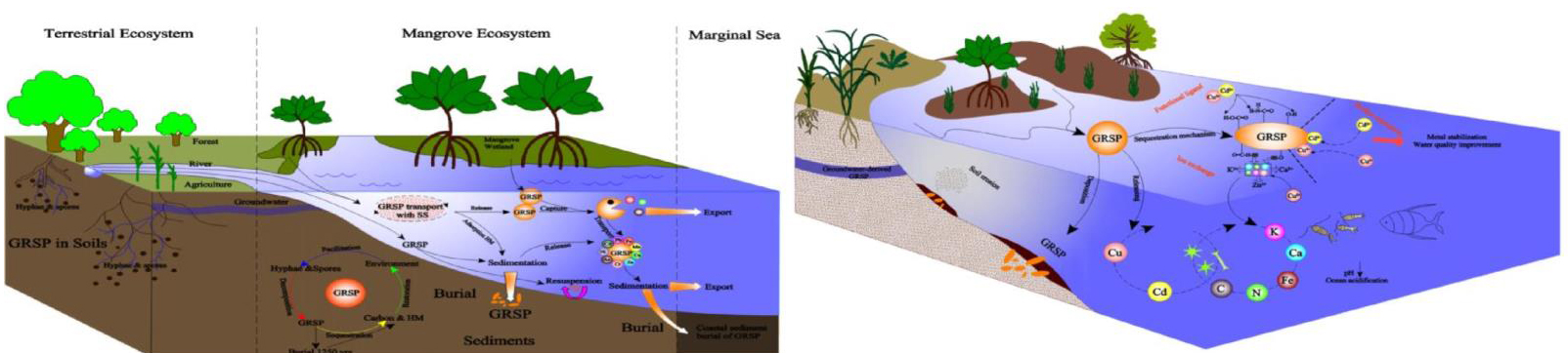该团队率先阐明了GRSP在红树林湿地的空间分布,明确了GRSP是滨海“蓝碳”的重要组分。作为海洋“蓝碳”的重要组分,GRSP传输并沉积在近海生态系统,GRSP可以作为陆-海连接指示剂,反馈陆源营养盐传输,且作为富铁载体,促进碳固定。发现GRSP可以结合土壤中的大量金属元素,调控金属元素的生物有效性。同时开展的室内控制及体外模拟实验,系统地揭示了GRSP的金属螯合机理主要包括官能团配体、离子交换和表面吸附,且GRSP与金属元素形成稳定的络合物,增强金属稳定性并促进水质改善。通过GRSP红外指纹结合多元分析,开发了一种重金属污染源识别技术,为滨海湿地重金属污染的来源提供了更可靠的证据。