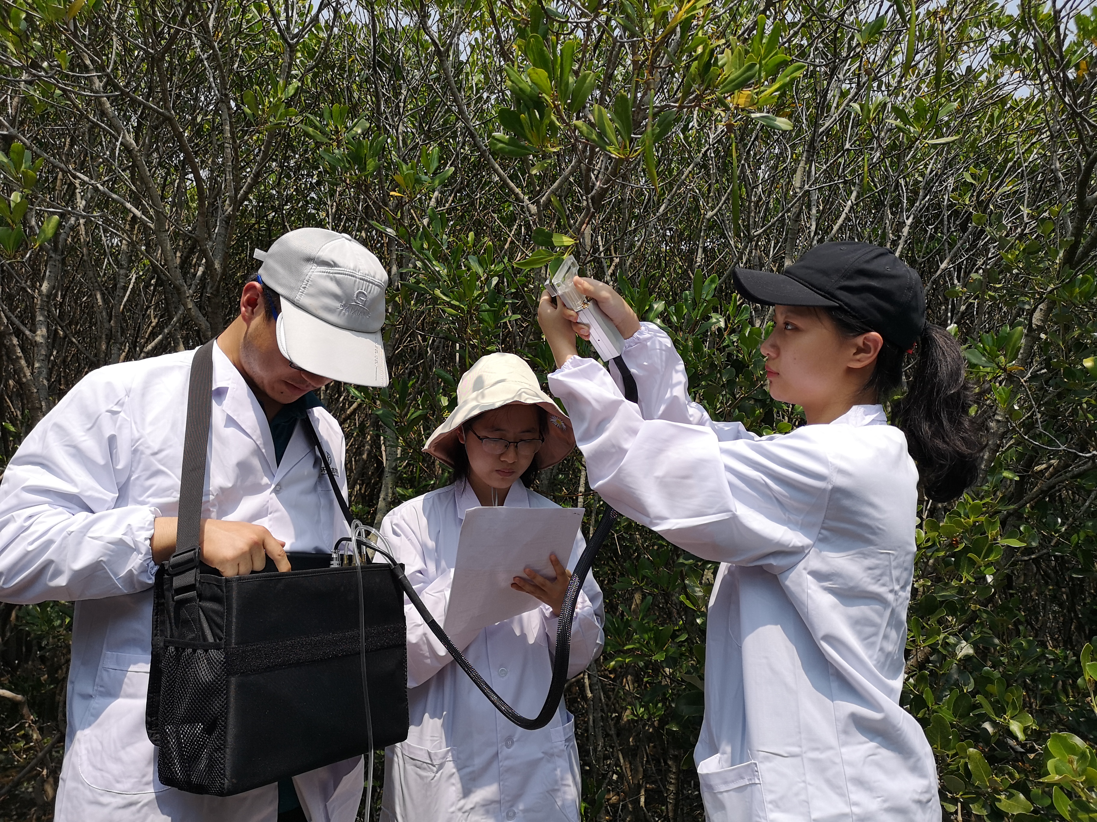 在保护区管理局工作人员的带领下,同学们踏上红树林科研考察栈道,对红树林开展近距离的观察。穿行在红树林中,同学们对秋茄、桐花、白骨壤等红树植物的胎生现象、泌盐现象、呼吸根系统等生长适应特征有了更为深入的认识;此外,红树植物叶片的光合速率的测定,从一定程度上帮助同学们理解了红树林群落的高生产力及其在碳汇方面的功能。