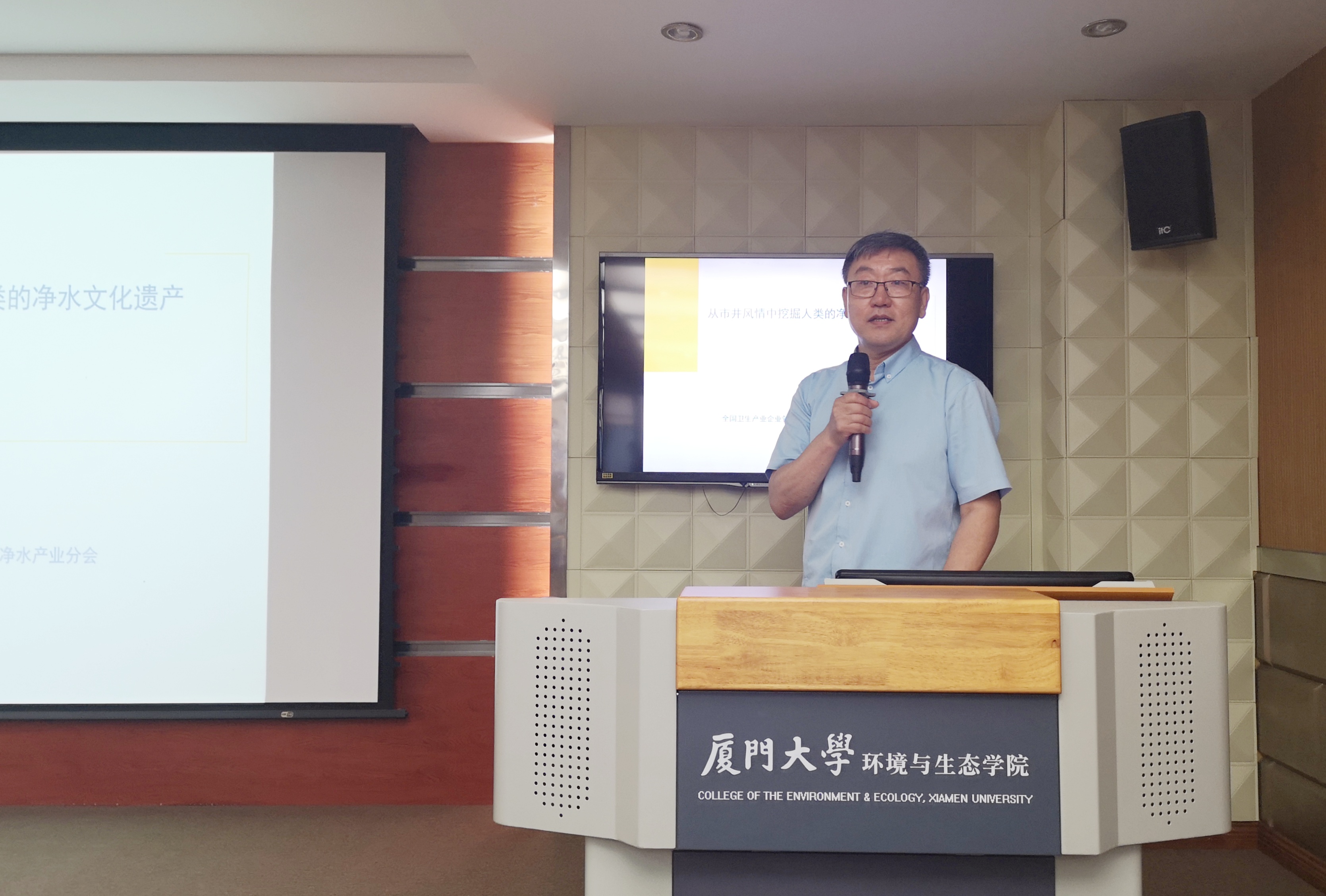 5月15日上午,学院与全国卫生产业企业管理协会净水产业分会(以下简称“净水产业分会”)联合开展的产学研系列活动——《文化、创新与人生》主题讲座,在金泉楼A239会议室举行。副院长王文卿、卓越班班主任杨盛昌、环境生态工程系副主任欧阳通及教师代表周克夫、闫俊美、刘珺等,同卓越班2018级、2019级本科生50余人参加了本次活动。净水产业分会副会长兼秘书长黄立,副会长、上海聚蓝水处理科技有限公司董事长吴菊素,常务理事、浙江聚倍科技集团股份有限公司董事长刘小林,政企事务部副部长、厦门百霖净水科技有限公司特助张丛升,美国邦登净水销售总经理赵亮和厦门百霖净水有限公司开发部高级经理梁德胜也参加了本次讲座。