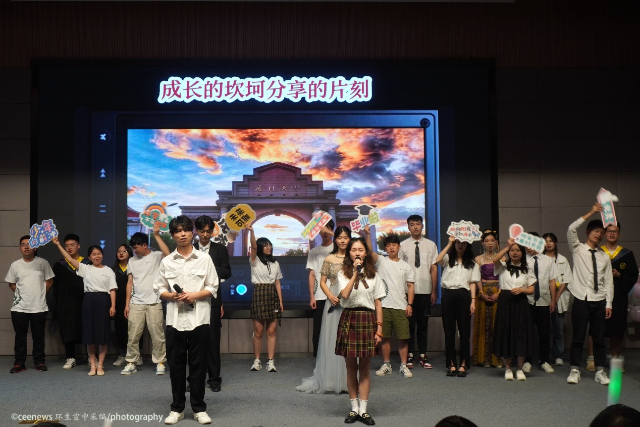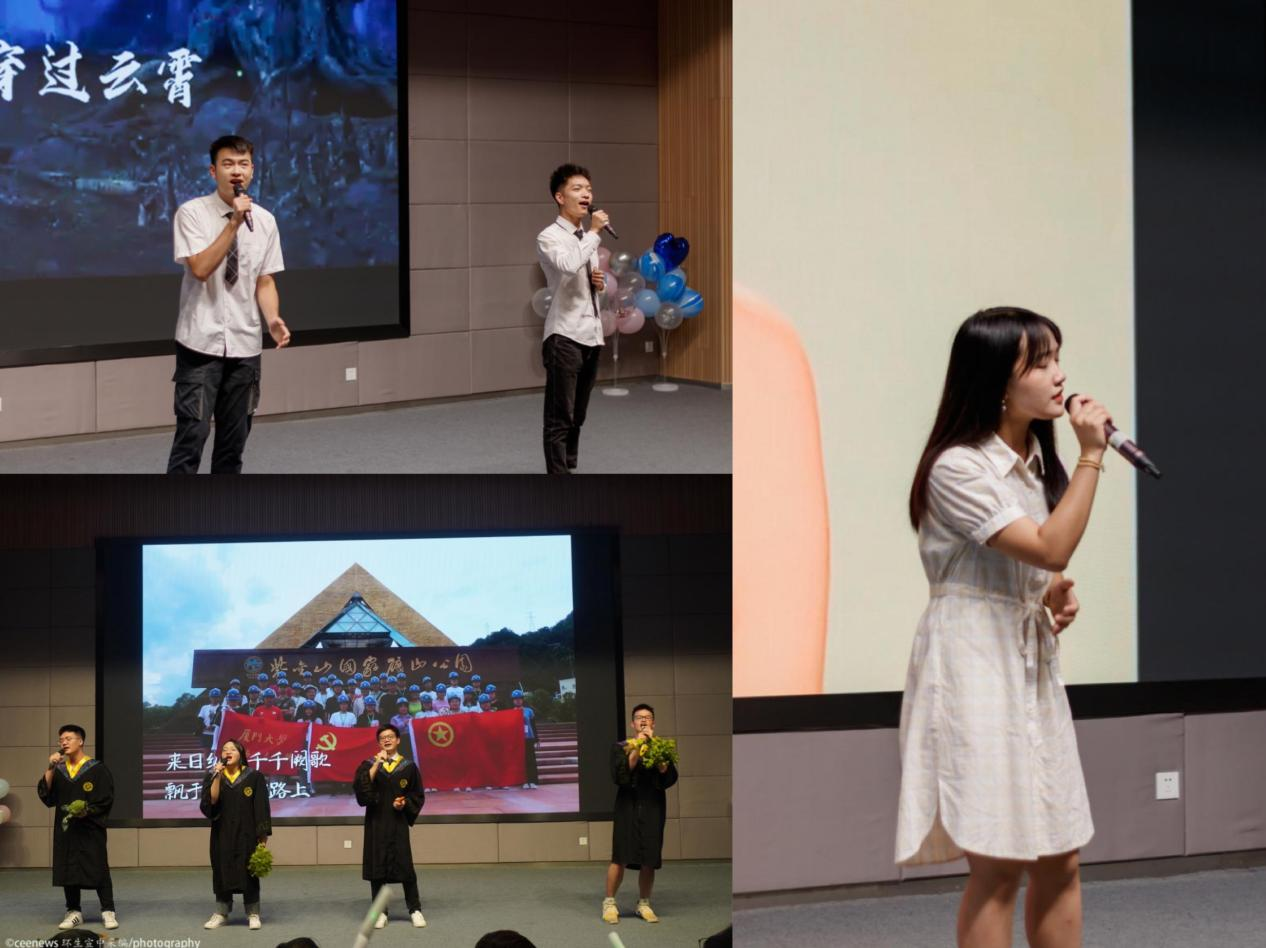 随后,赖子祥、盛飞带来的歌曲《鹿 be free》展现了每位学子自由追梦的志气;韩东倍带来的歌曲《逆光》绽放出属于环生学子的万丈光芒;李澳、黄昕、刀皓莎、陈超演唱的《千千阙歌》,动情的旋律走进每一个毕业生的心里。