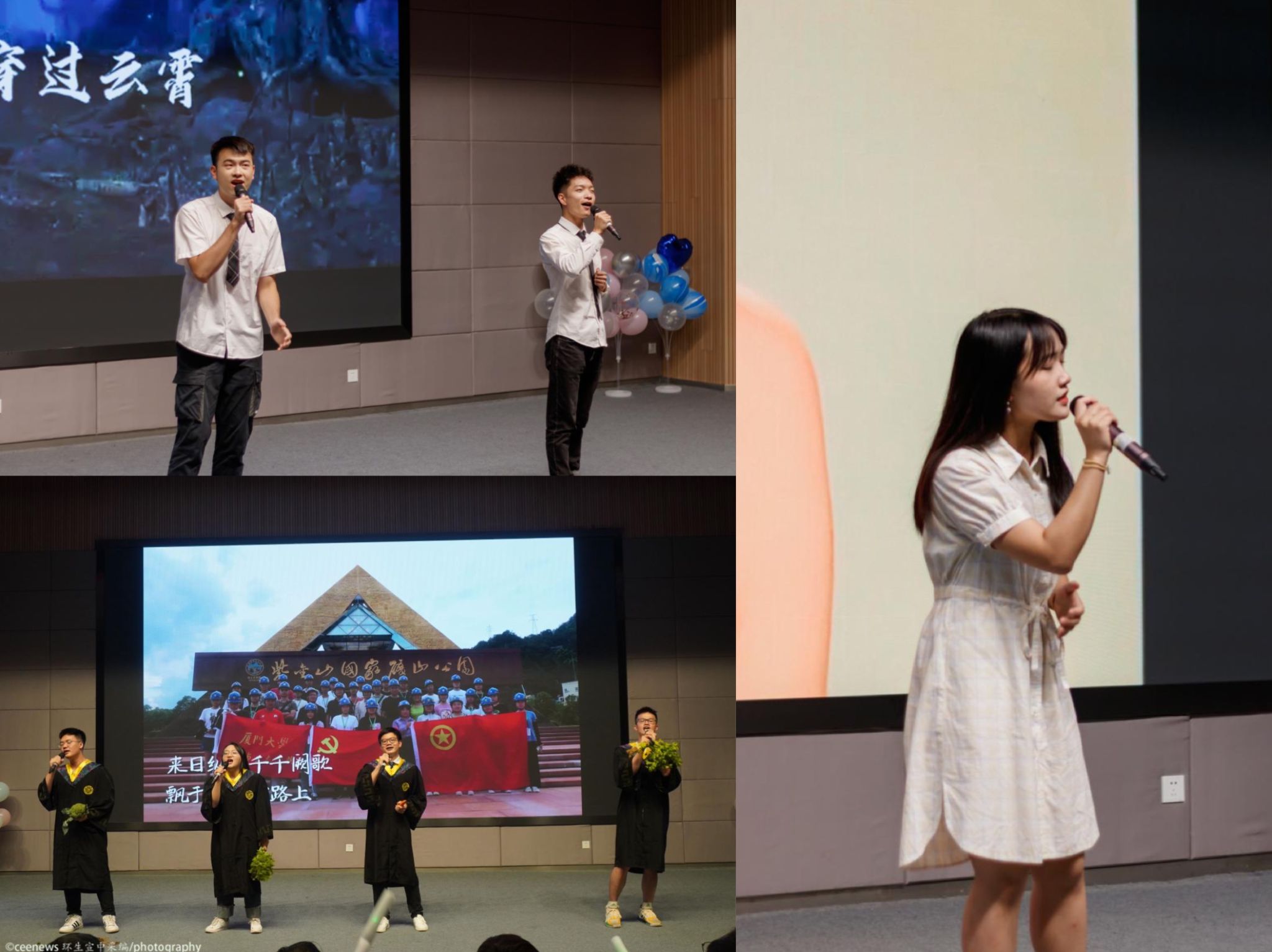 2022届本科毕业生代表吴辉煌、硕士毕业生代表周志帆、博士毕业生代表田园依次上台发言。他们表达了自己对厦园生活的回忆与感慨,对关心帮助过自己的老师同学的不舍与感激,并呼吁全体毕业生当立鸿鹄之志,做青春的奋斗者、搏击者、奉献者。