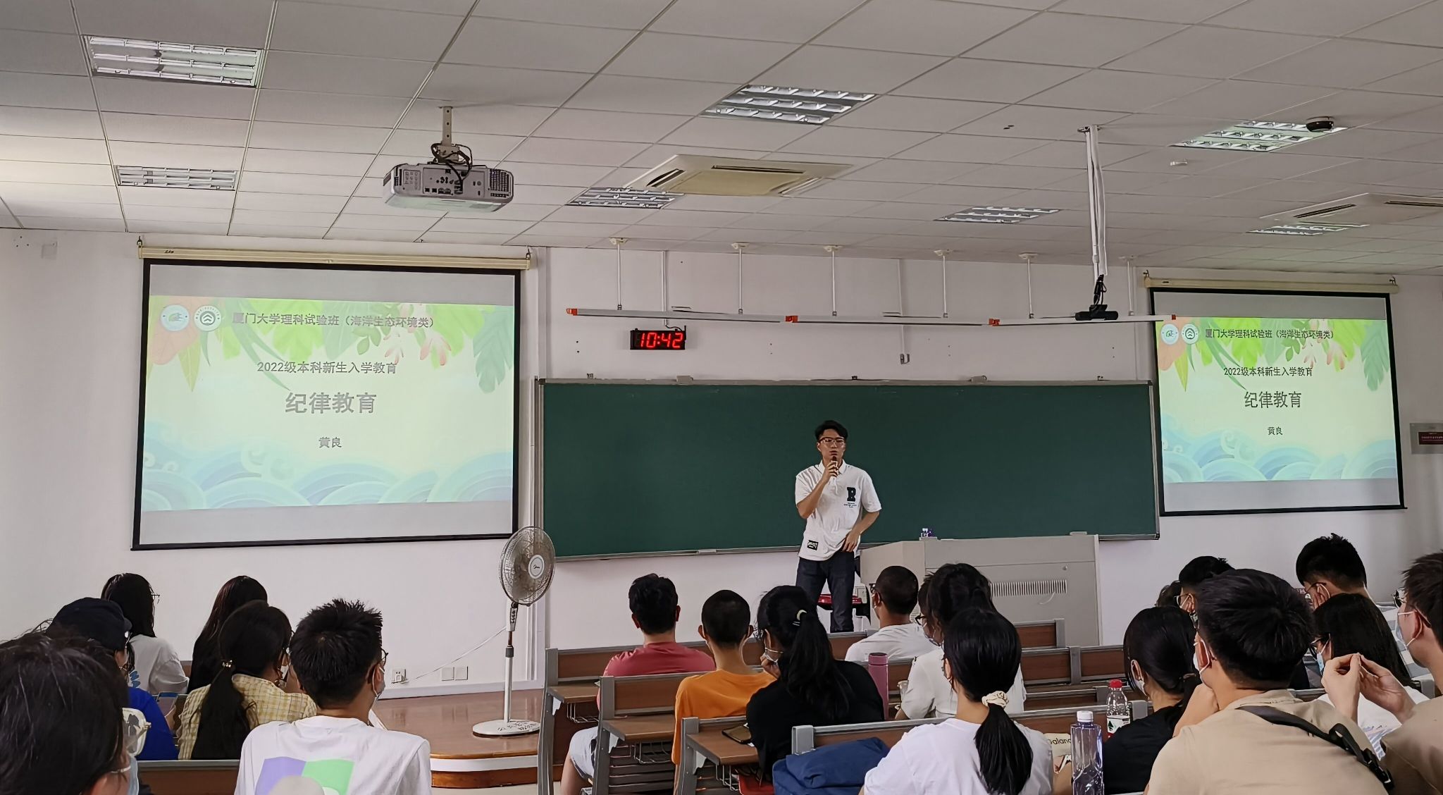 9月8日上午,理科试验班(海洋生态环境类)的两位辅导员王安胜老师和黄良老师为2022级的同学们进行了规章制度、诚信和住宿生活等方面的教育。两位老师结合相关违规案例,为同学们详细解读了《厦门大学学生违纪处分规定》《厦门大学考试纪律及违规处理办法》及《厦门大学翔安校区学生住宿行为规范》等文件规定,让同学们深刻理解到,校规校纪是学习生活的保障,是必须认真学习遵守的。