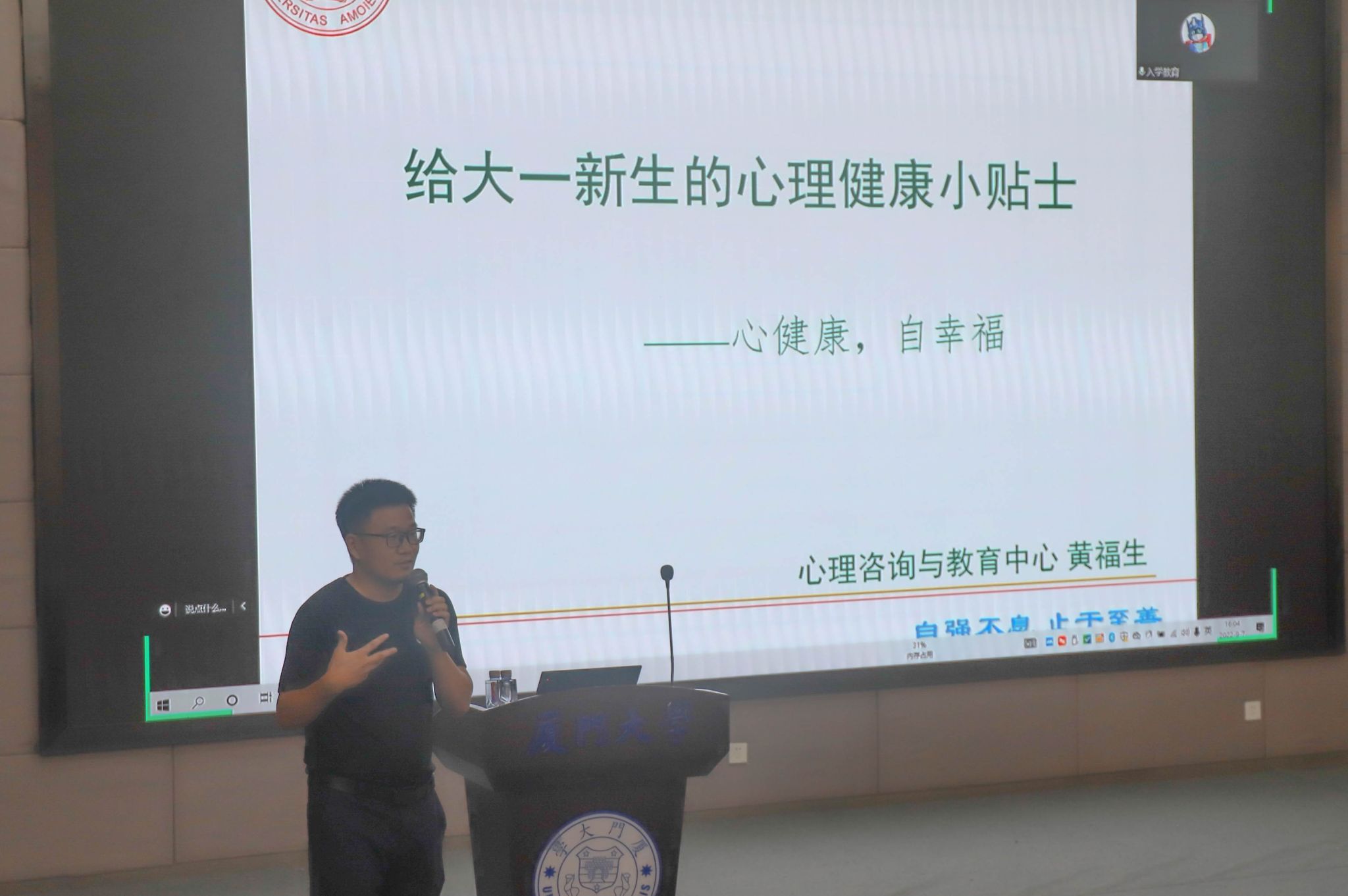 活动的下半段,校心理咨询与教育中心副主任黄福生为新生开展心理健康专题报告。黄老师通过分享几个带有童趣的小故事,教导同学们如何学会积极转变心态,化压力为动力,引导学生更好地形成健康良好的心态,提高心理免疫力,尽快适应大学生活。
