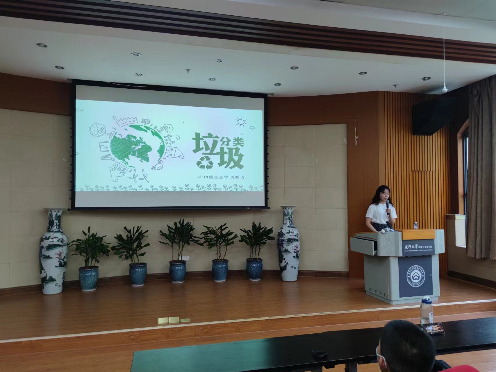 生态学系2019级本科生郭晓语同学以《厦门经济特区生活垃圾分类管理办法》为依据,为新生介绍了宿舍、实验室、公共教室等校园生活场所垃圾分类的要求、垃圾分类的意义以及厦门市生活垃圾分类标准和分类处理体系等知识,引导新生们积极养成垃圾分类的良好习惯。