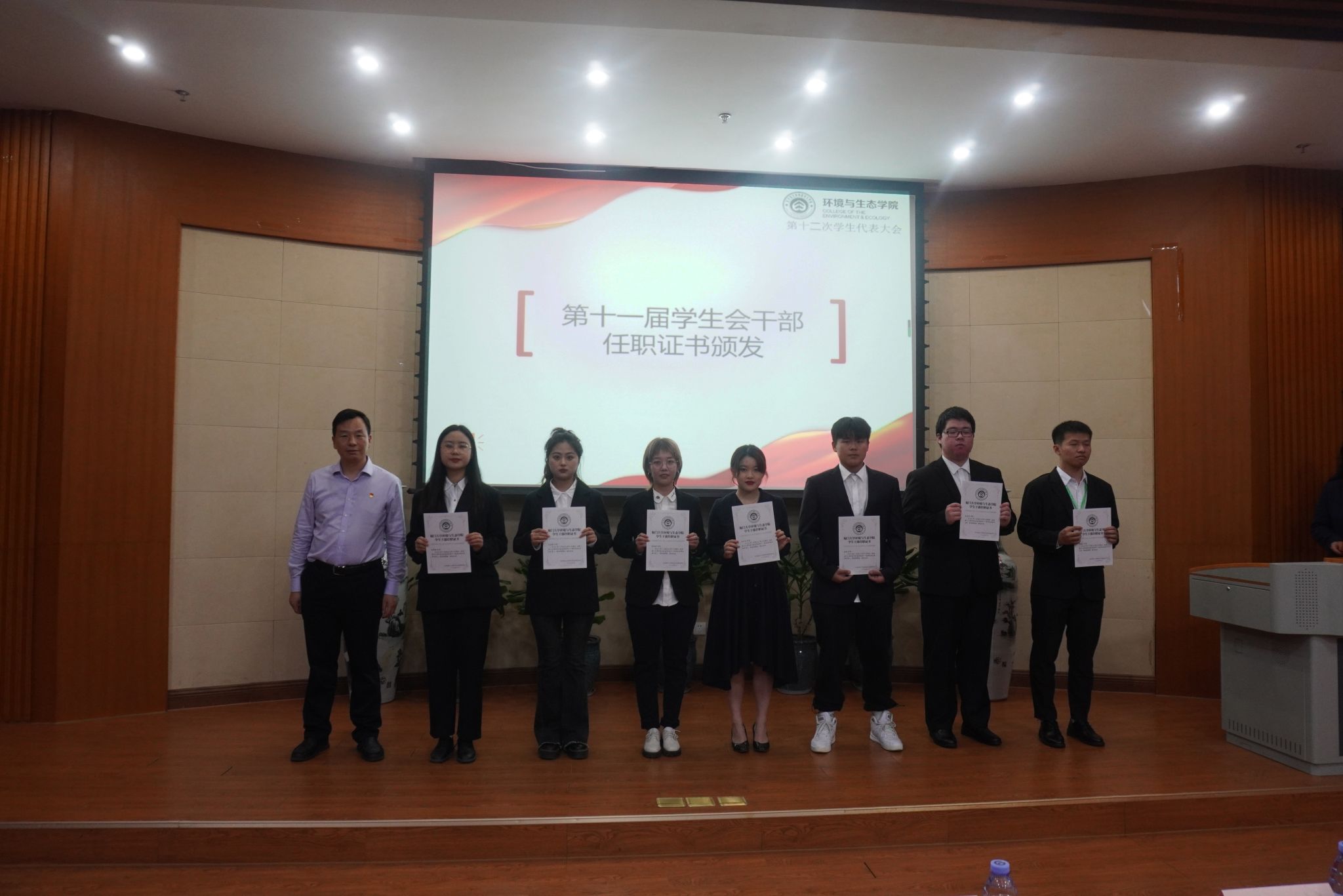 随后,第十一届学生会执行主席高悦皓作为代表进行工作总结报告。蔡虎堂为第十一届学生会干部颁发任职证书。