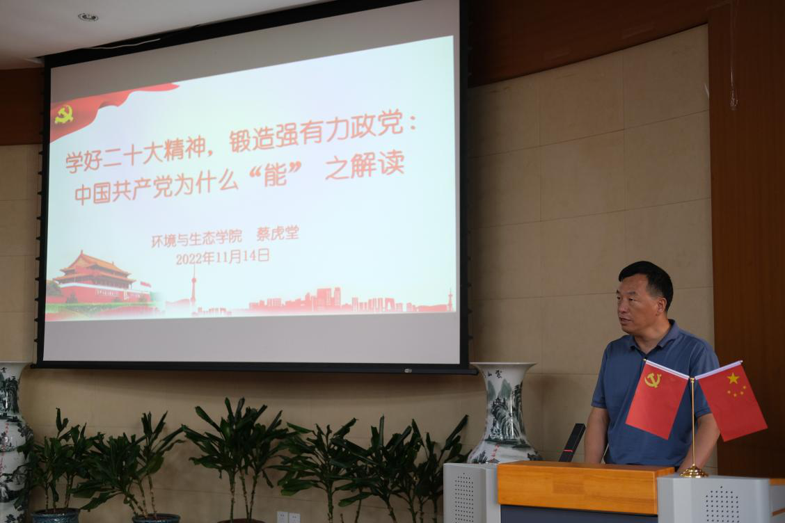 本年次党团活动月的第一项活动是由蔡虎堂为同学们带来《学好二十大精神,锻造强有力政党:中国共产党为什么“能“的解读》的专题讲座。讲座分为两部分。第一部分他向大家介绍了党的二十大的盛况以及重要意义,以此引申到第二部分中国共产党为什么“能”。在讲座中,他从科学的理论指导、坚定的理想信念、强大的组织优势、坚实的群众基础和彻底的自我革命五个方面全方位解读中国共产党“能”的原因。讲座最后他指出,我们的党无愧为伟大、光荣、正确的党!我们的人民无愧为伟大、光荣、英雄的人民!百年大党恰是风华正茂,作为新时代大学生,我们要爱这个党,爱这个人民,爱这个国家。我们要向党组织积极靠拢,争取早日成为其中的光荣分子。