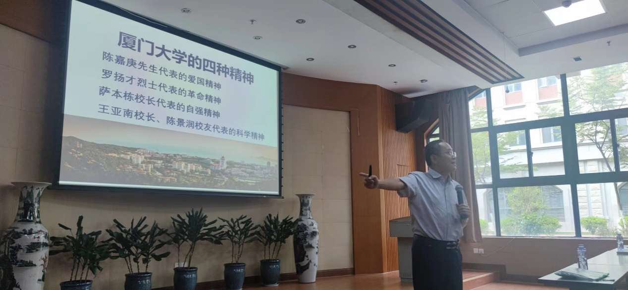 数学科学学院林亚南老师以“陈景润的传奇人生和精神魅力”为题,动情讲述这位著名校友的传奇人生,传达了厦门大学四种精神中的“科学精神”,将厦大科学精神深深烙在每位同学的心中,指引他们未来学习前进的方向。