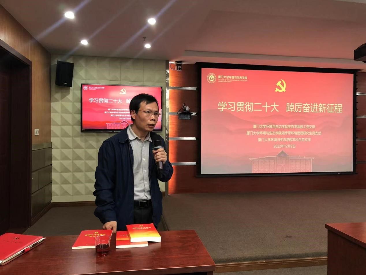 12月2日中午,我院生态学系教工党支部、海岸带环境管理研究生党支部和本科生党支部,在金泉楼A239联合举办“学习贯彻二十大,踔厉奋进新征程”主题党日活动。活动由生态学教工党支部书记卢豪良教授主持。