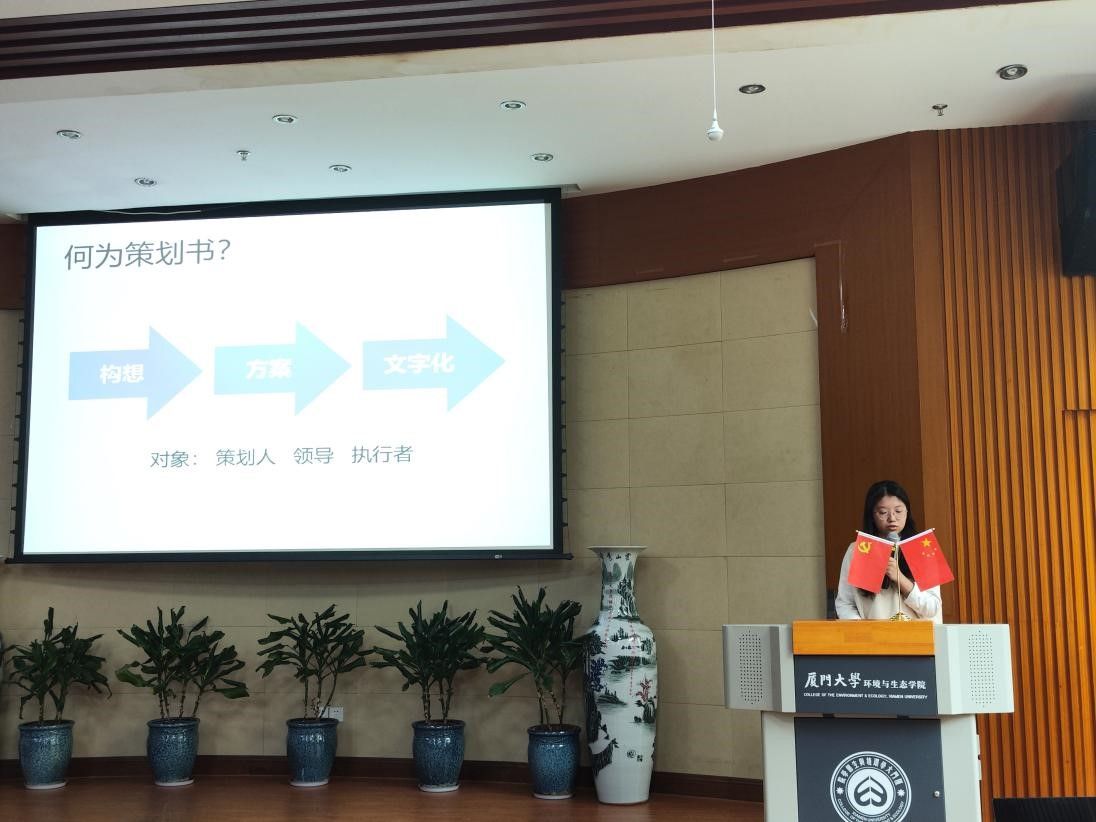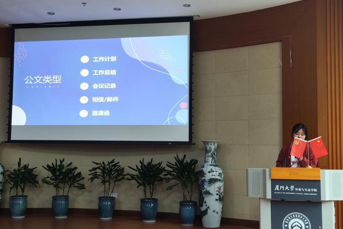 随后,各学生部门负责人对新一届学生干部进行相关技能培训。联络部负责人章钰进行了策划书撰写培训。权益部负责人史一君对本部门工作流程进行了介绍,并讲解了场地使用等相关注意事项。发展部负责人徐可欣进行公文写作培训,介绍了不同种类公文的撰写要求。三个部门负责人发言完毕后,第一日学生干部技能培训告一段落。