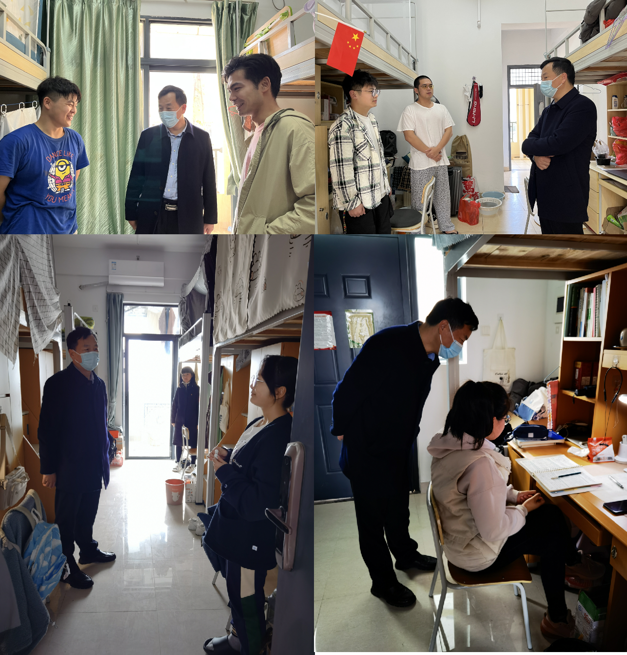 在本科生毕业班宿舍,蔡虎堂详细询问学生的考研以及就业情况,叮嘱同学们要利用好春招的机会,通过面试不断提升求职能力。同时他还为同学提供就业建议并预祝同学们早日找到心仪的工作;在本科生新生宿舍,蔡虎堂耐心询问大一新生的大学生活适应情况,嘱咐同学们要从假期状态转为学习状态,及时调整好作息,做好复习考好试,以饱满的热情投入到新学期的学习当中;在大二大三学生宿舍,蔡虎堂再次叮嘱同学们注意用电安全、房间卫生以及规律作息等。