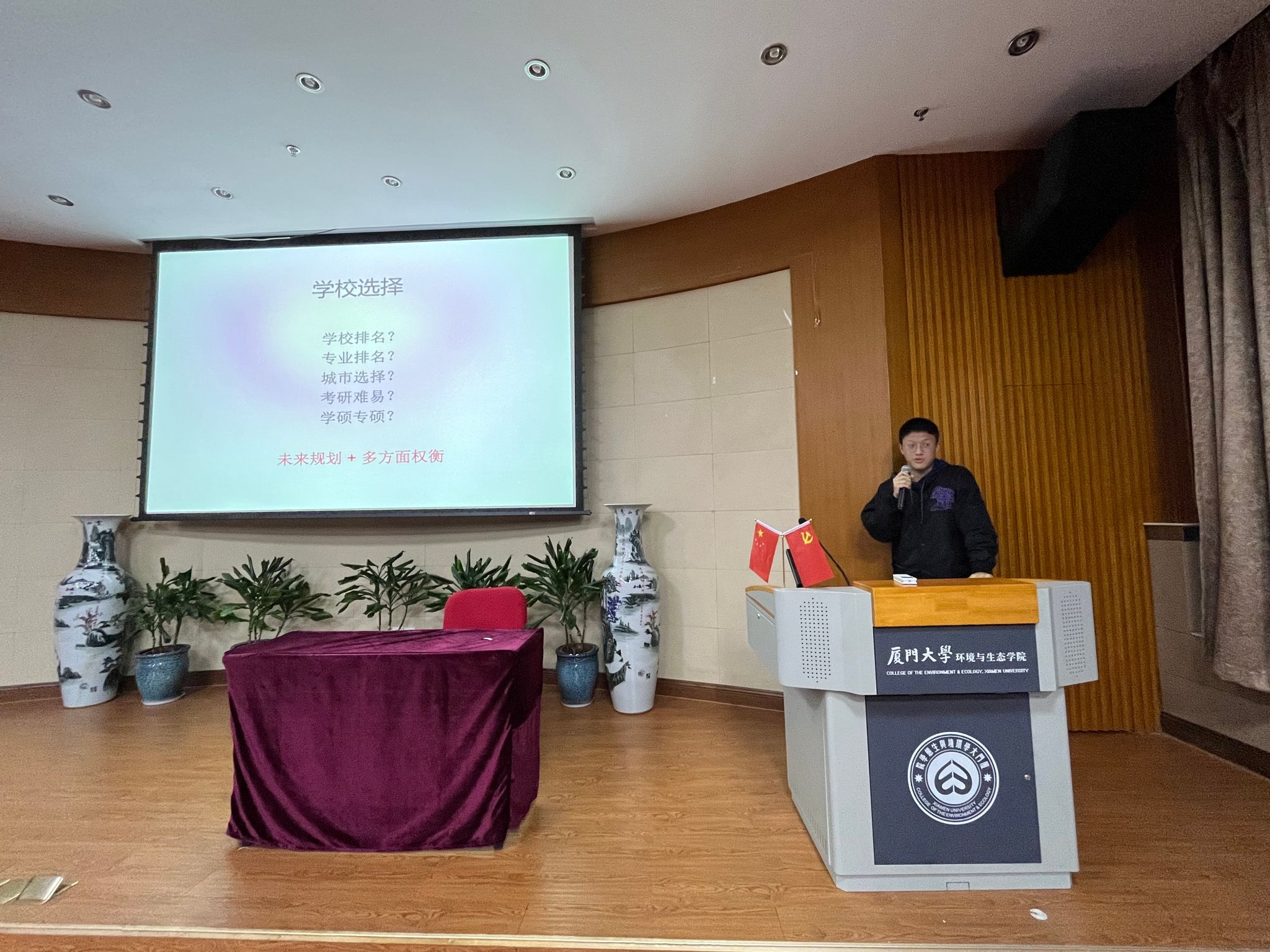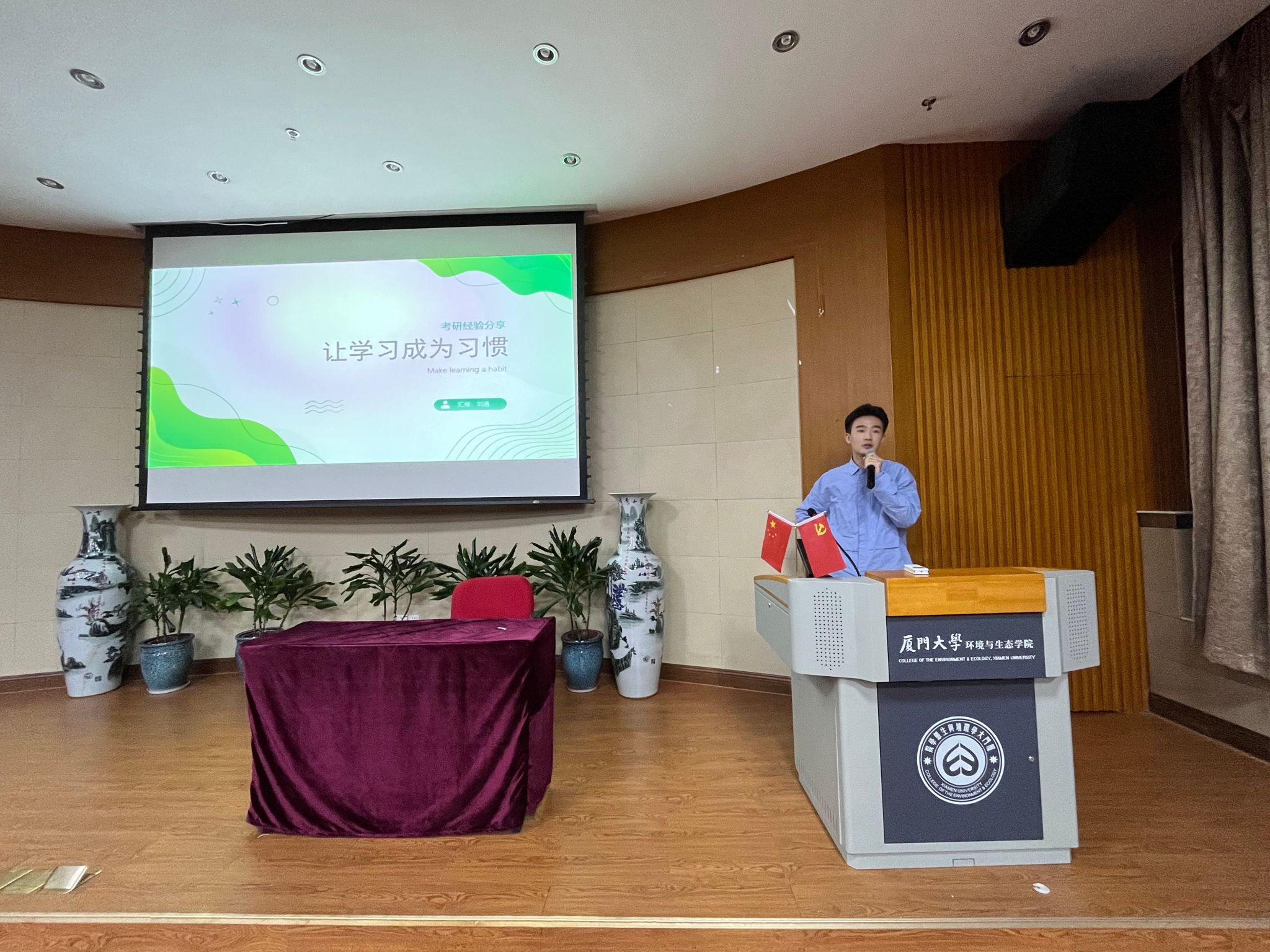 首先进行分享的是2019级环境生态工程专业的姜缘同学。他先向同学们介绍了考研的流程以及检索信息的常用方法,接着结合自己考研的经历详细介绍了公共课和学科专业课的备考方法和相关资料。他强调,考研需要坚持,要保证每天8小时以上的学习时间,同时要劳逸结合。