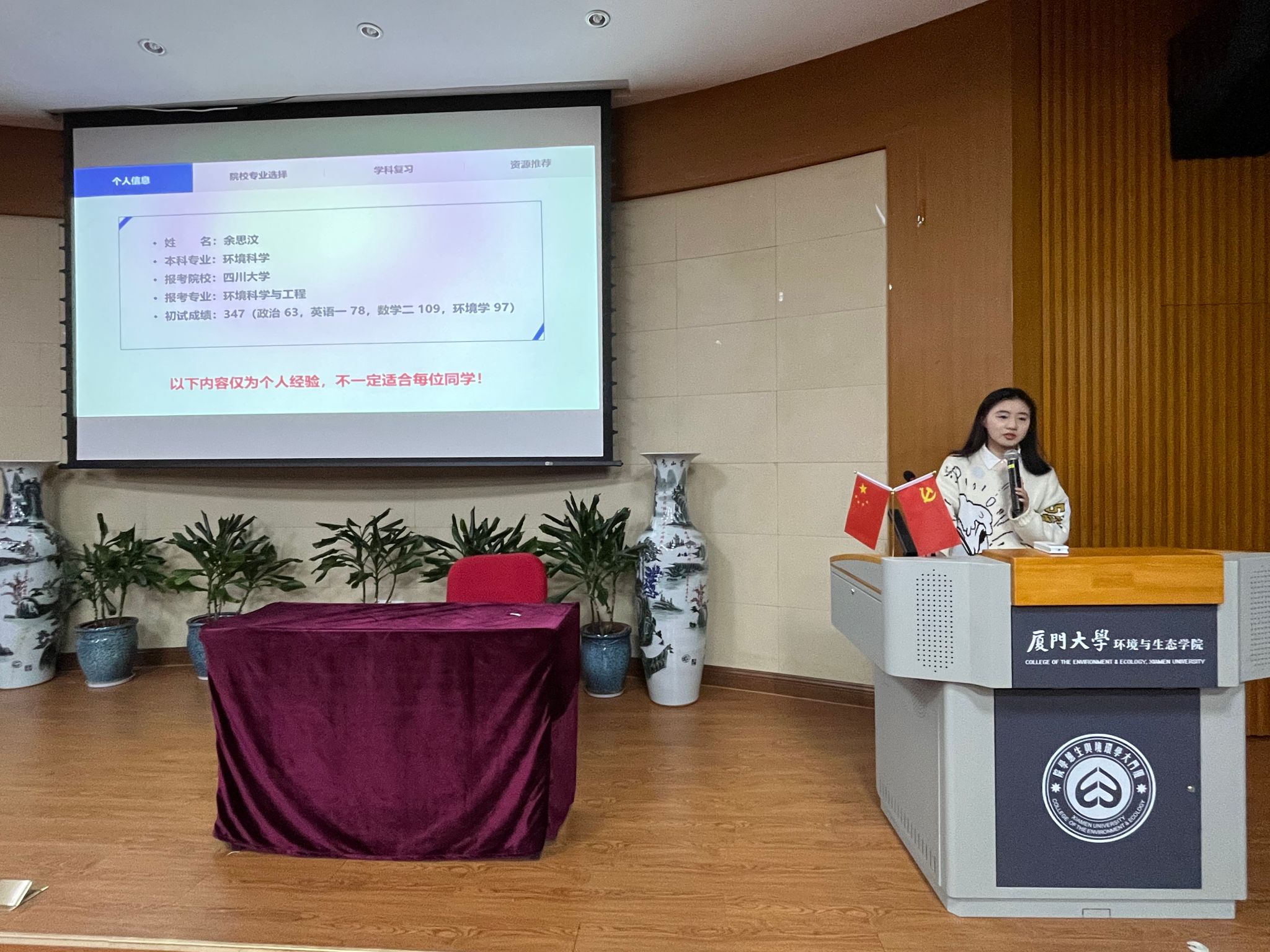 最后来自2019环境科学专业的余思汶同学结合自己考研四川大学的经验,向同学们介绍了院校及专业选择的重要性,并就学科复习分享了自己的经验,建议同学们重视专业课的备考,用心、全面地复习备考。