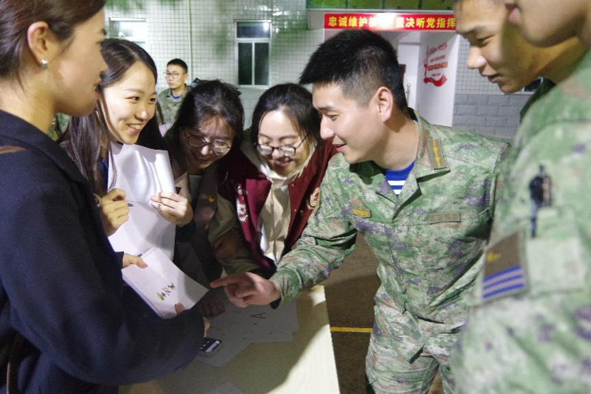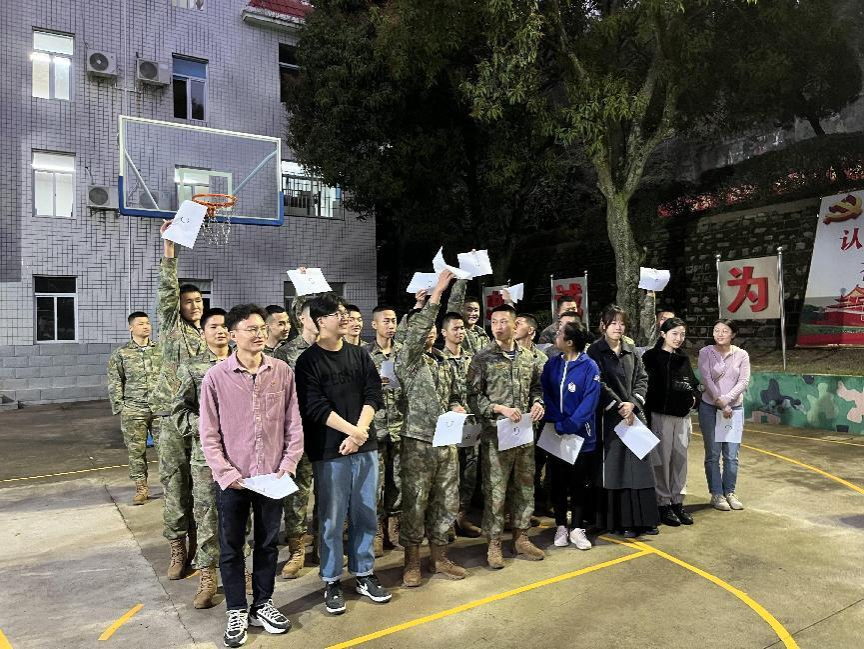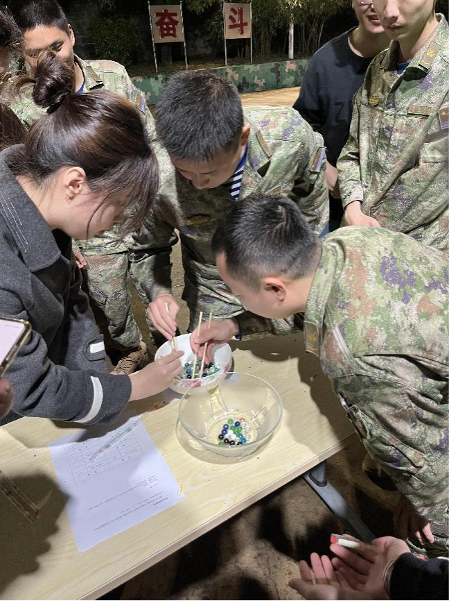 学生和军人们还投入到了由我院同学策划的知识竞答和趣味小游戏之中。2021级研究生游志凌担任主持人,开展党的二十大精神要点知识竞答,以及看表情包猜成语、夹弹珠、博饼掷骰等游戏。