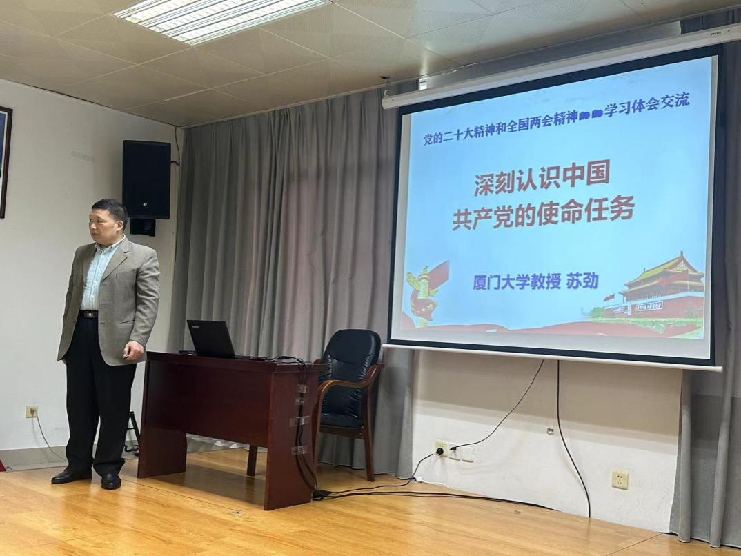 马克思主义学院的苏劲教授带来一堂《深刻认识中国共产党的使命任务》的党课,他用精炼的语言将党的二十大精神与全国两会精神娓娓道来,引导大家回顾了党的百年奋斗历史以及迈入新时代所肩负的使命和任务。