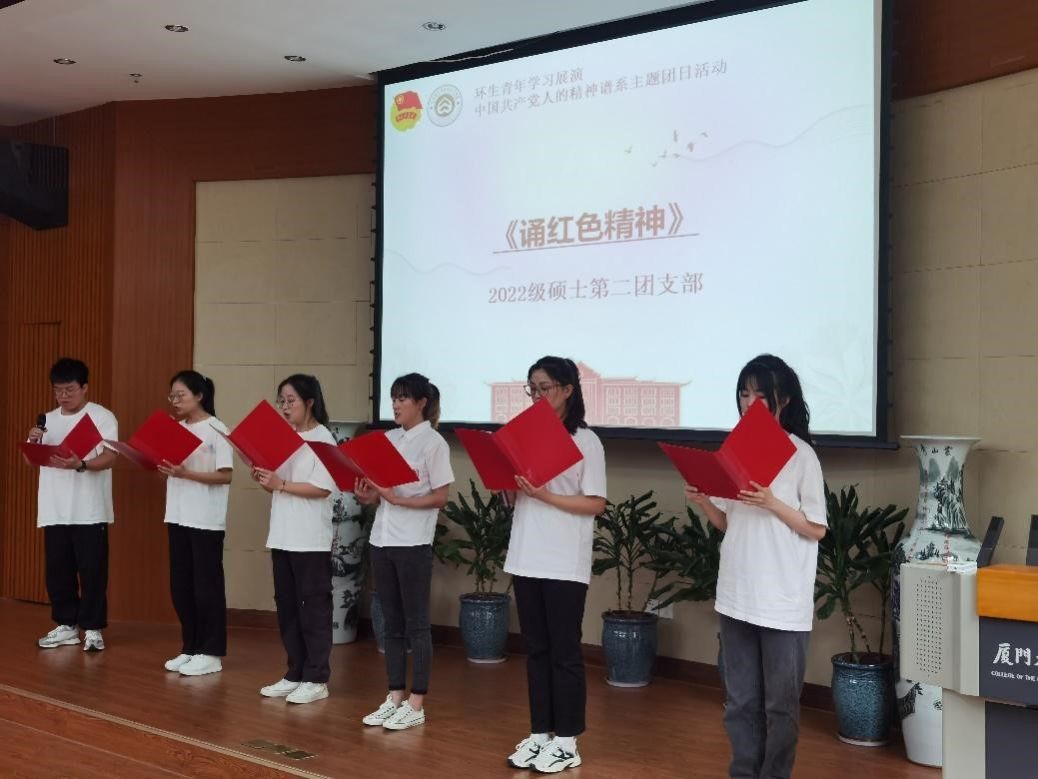 首先登场的是2022级硕士生第二团支部。他们带来了声情并茂的诗歌朗诵《诵红色精神》,向观众展示了中国共产党在革命战争年代坚持理想信念、不断奋斗、勇攀高峰的精神风貌,让观众感受红色文化的同时,也深刻理解了中国共产党的伟大精神。