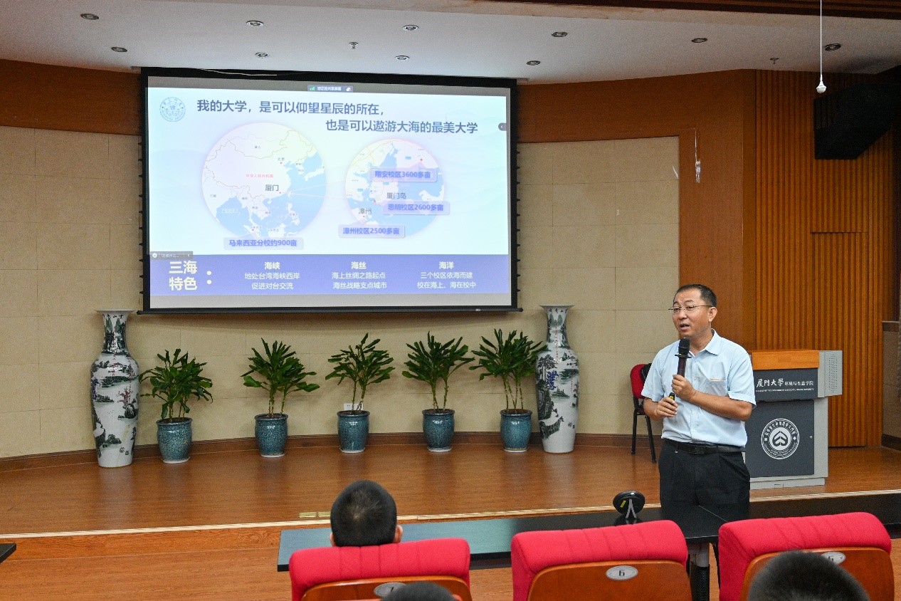 回顾完厦门大学的发展史,黄凌风介绍了我院的基本情况。我院的发展生逢其时,具备前瞻性和及时性,虽然建院只有十余年,但已取得比较瞩目的成就,学科影响力逐年提升,具备良好的发展前景。他以漳江口研究站、台海站研究站、嘉庚号科考船等为例,介绍了学院为学生提供的丰富的实习资源和先进的实习平台。这些平台旨在培养学生的实践创新能力和科研能力,让学生能够亲身参与海洋科学的探索和发现。有趣的实习过程也引得台下掌声连连。展望未来,他分享了环生院应届毕业生的就业情况和学院未来的发展宏图。最后,他分享了学院优秀学生的故事,鼓励新生们以她们为榜样,不断提高自己的能力和素养,以梦为马,不负韶华。