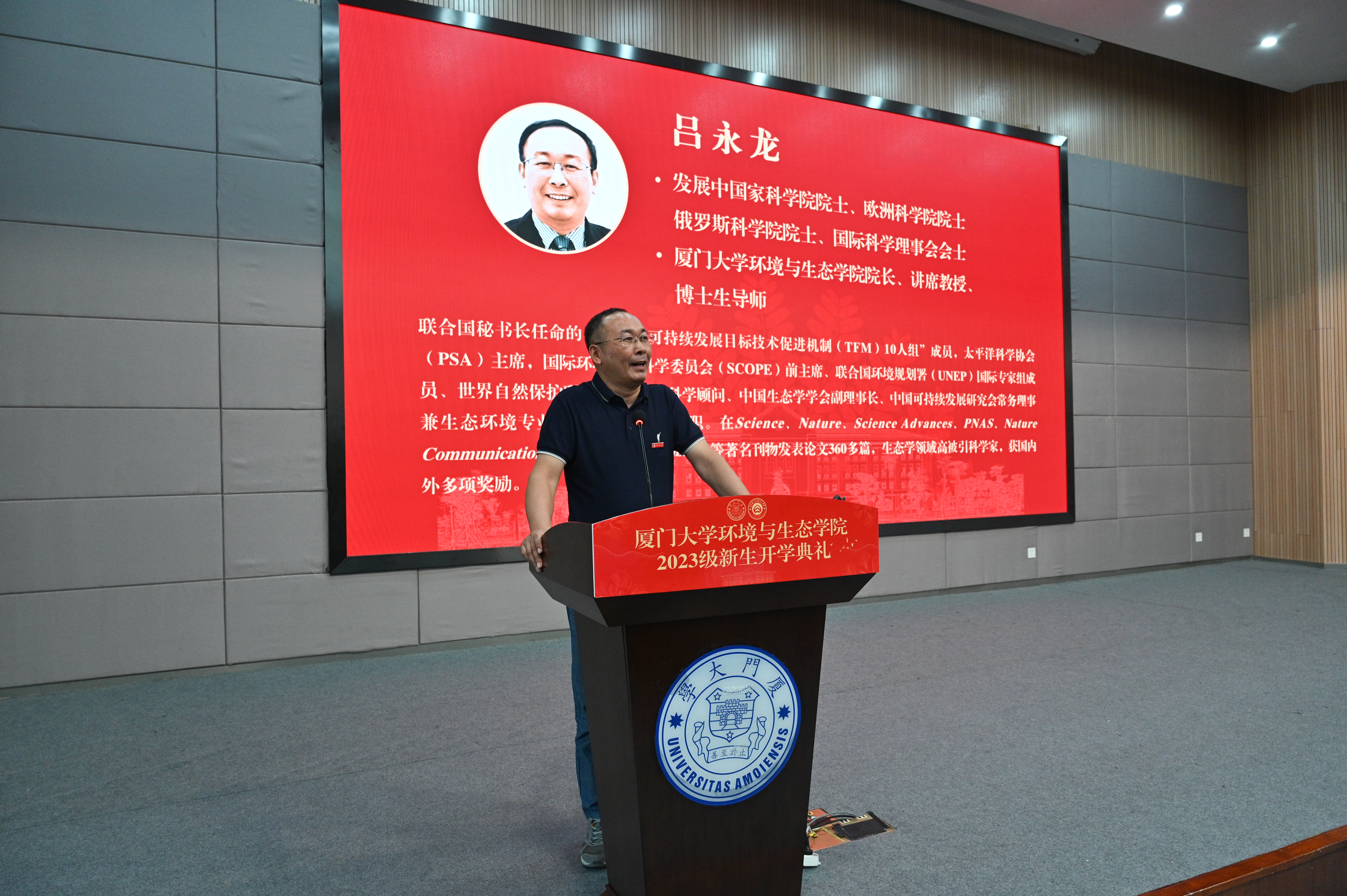 院长吕永龙教授首先致辞。他代表学院对2023级新生表示热烈的欢迎和祝贺。吕永龙说到,今年7月17日至18日,全国生态环境保护大会召开,习近平总书记出席会议并发表重要讲话,同学们生逢盛世,恰逢其时,希望大家秉承厦门大学“自强不息、止于至善”的校训,肩负起时代赋予青年的使命。他说,网络上流行的所谓生化环材"四大天坑专业",都是事关国计民生的专业。生物和生态学科事关健康和食物安全,事关人与自然和谐的现代化建设;化学类专业事关日常生活和产业发展,那么多的新技术新产品是通过化学手段产生的;环境类专业事关环境质量改善和生态安全,关乎人类可持续发展,为生态环境保护和可持续发展国家发展战略实施提供科技保障;材料类专业事关许多"卡脖子"技术突破问题,有大量值得深入探讨的新材料新技术,为新的产业革命和转型发展提供新方向新机遇。他深入阐述了学院“强基础、重特色、宽领域、高质量”的人才培养目标,强调学院将进一步加强专业教育,着力培养一流人才,教育引导学生全方面发展。最后,他寄语新生们用奋斗书写青春,努力成为新一代的自然探索者和生态文明建设者,在世界可持续发展舞台上发出中国青年的最强音。