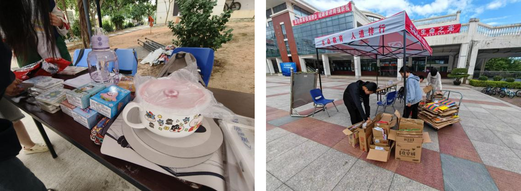 活动伊始,志愿者向师生介绍该活动的理念及意义,并详细说明此次活动的参与方式。活动期间,同学们踊跃参与,贡献自己积累的纸箱。同时,摊位处的志愿者引导参与者按照规则进行纸箱和积分转换,再以积分来兑换陶瓷碗、文件夹、卡通积木等精美礼品,并在志愿者的指导下将纸箱折叠、压实后放到回收推车上。