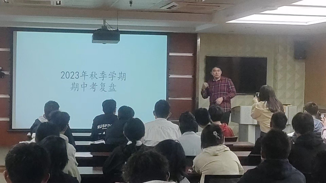 接下来洪华龙为同学们进行了期中考试复盘,以同学们提前填写的问卷以及所了解的情况为基础,利用图表全面系统地分析了同学们对期中考试的态度,期中考试的难度,以及成绩不理想的原因等问题,并鼓励同学们努力学习,希望同学们在期末考试中取得自己满意的成绩。在复盘过程中,洪老师不时与台下互动,在加深复盘印象的同时缓解了紧张的氛围,在场同学无不受益匪浅。