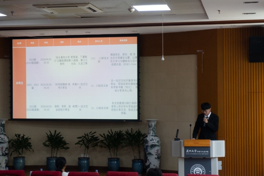 郑淑真介绍了团员意识教育活动月的具体内容。她表示,活动旨在加强学风建设和培育一流的教育环境,包括制作“环生青年大学习”的主题团课视频、“科学家精神”的读书分享会,以及保研、考研、就业经验分享会等,希望同学们能借助这些活动,深入学习党史和团史知识,增强对学科的理解,促进各团支部和班级的建设。