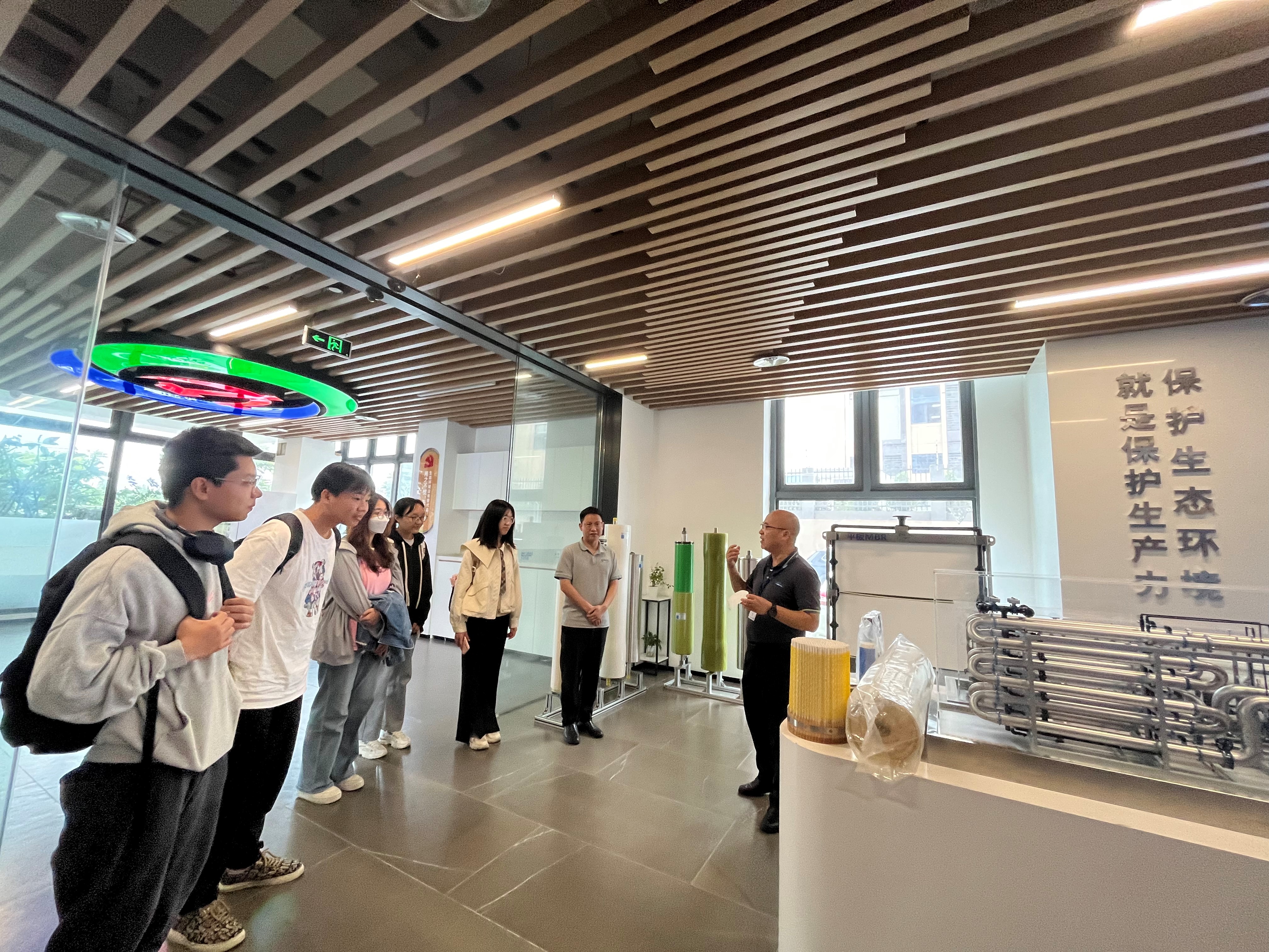 在厦门嘉戎技术股份公司有关负责人黄赟、邹永峰的引导和讲解下,同学们了解了厦门嘉戎技术股份公司的发展历程、基本规模以及架构体系,以及中转站渗滤液处理设备、集装箱式渗滤液处理设备和高性能特种膜产品等等。黄赟以重庆长生桥渗滤液全量化处理项目为例,向同学们详细介绍了研发成果的应用,包括垃圾渗滤液处理、工业废水处理及资源回用等等。随后,同学们前往智能化膜组件等一系列生产线上及研发实验室里观摩学习。