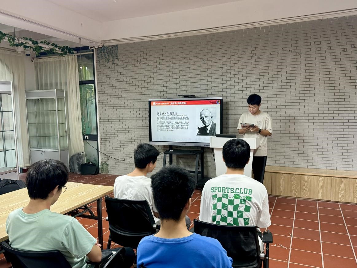 张至程带同学们走进了美国生态学家奥尔多·利奥波德的世界,他在保护荒野和野生动植物方面的卓越贡献令人肃然起敬。其代表作《沙乡年鉴》中所提出的“土地伦理”理念,深深触动了在场的每一位同学,他倡导人类应怀有对自然的敬畏之心,追求人与自然的和谐共生。