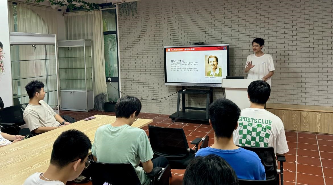在本次读书分享会上,四位同学分别深情地讲述了四位杰出的科学家和他们的著作。叶天恒通过《寂静的春天》一书,向我们揭示了化学农药对环境的无情侵蚀和对生态系统的潜在威胁,呼吁同学们积极参与到生态文明建设中,通过实际行动保护环境,促进绿色发展。