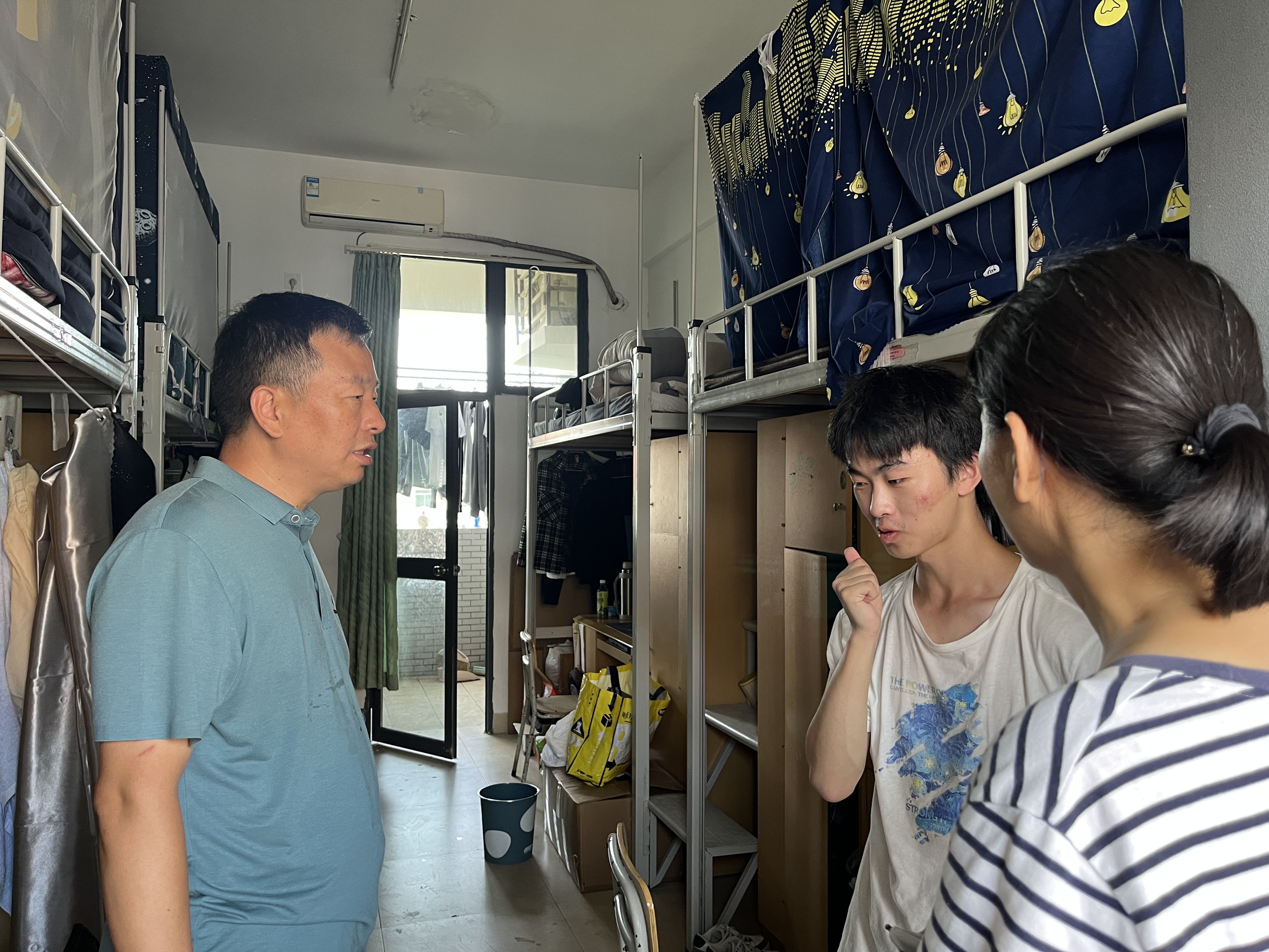 走访过程中,学工组成员详细询问了留校学生的学习计划、科研进展以及生活中的困难和需求,逐一排查宿舍、工作室存在的安全隐患,并现场发放整改通知单,督促限期完成,确保整改到位。学工组还特别强调了水电安全、饮食卫生、防暑降温、防盗防骗、网络安全等方面的注意事项,提醒学生务必提高安全意识,做好个人防护。尤其是针对即将到来的台风天气,要求同学们密切关注气象预报和学校各项安全通知,要提前做好防范措施,确保个人安全。
