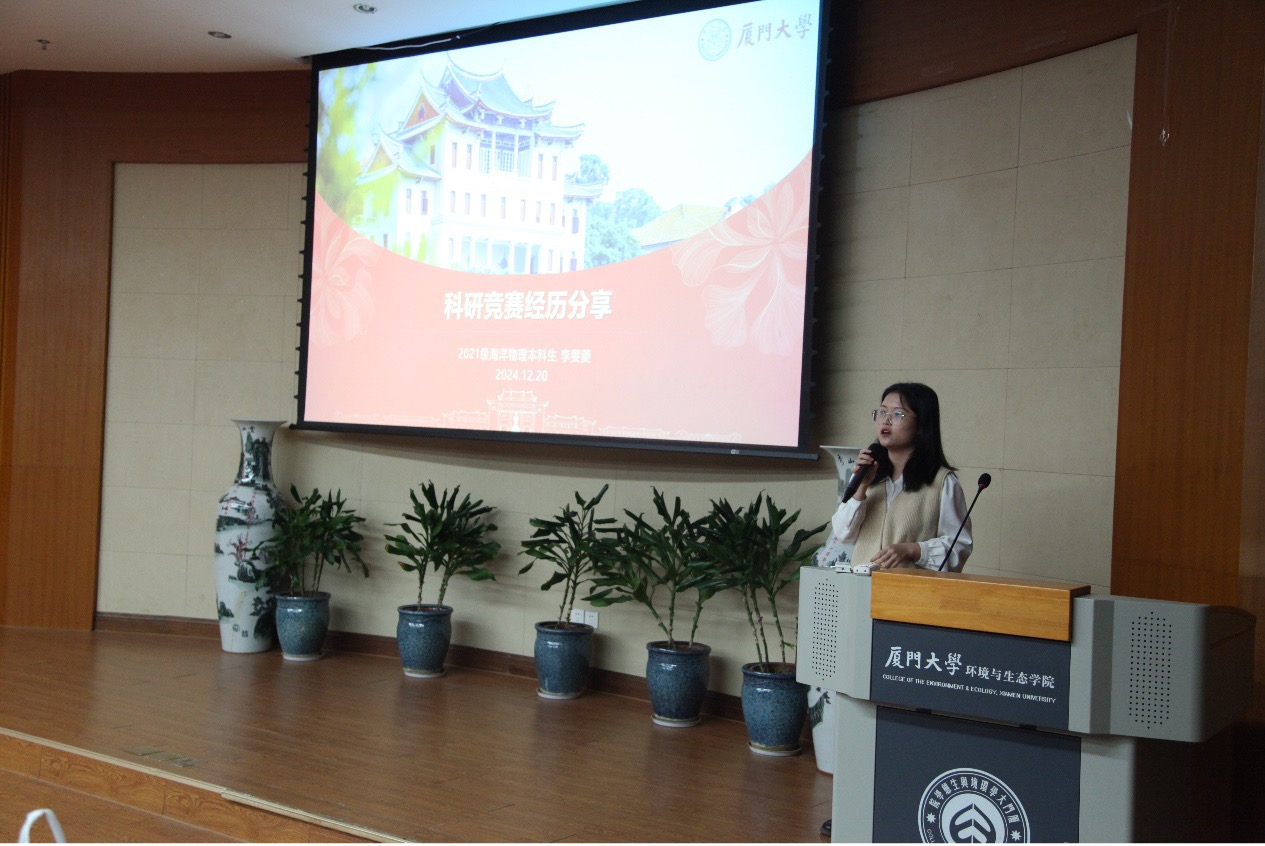 最后分享的是2021级海洋物理专业的李雯菱同学。凭借自己丰富的科研经历,她为同学们提供了四种有效的科研训练方法,并结合自己的竞赛经历,进行了深入的竞赛经验分享。她强调,在科研和竞赛的过程中,良好的沟通能力、深入的钻研精神、持续的学习态度以及强大的抗压能力至关重要。李雯菱同学鼓励同学们要在不断探索的过程中,坚持不懈地付出,才能在科研道路上获得真正的成长。
