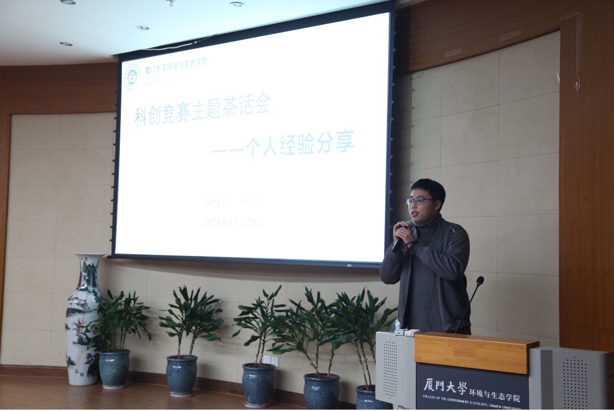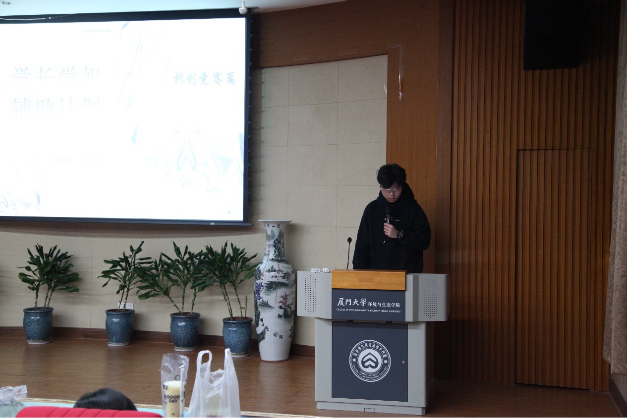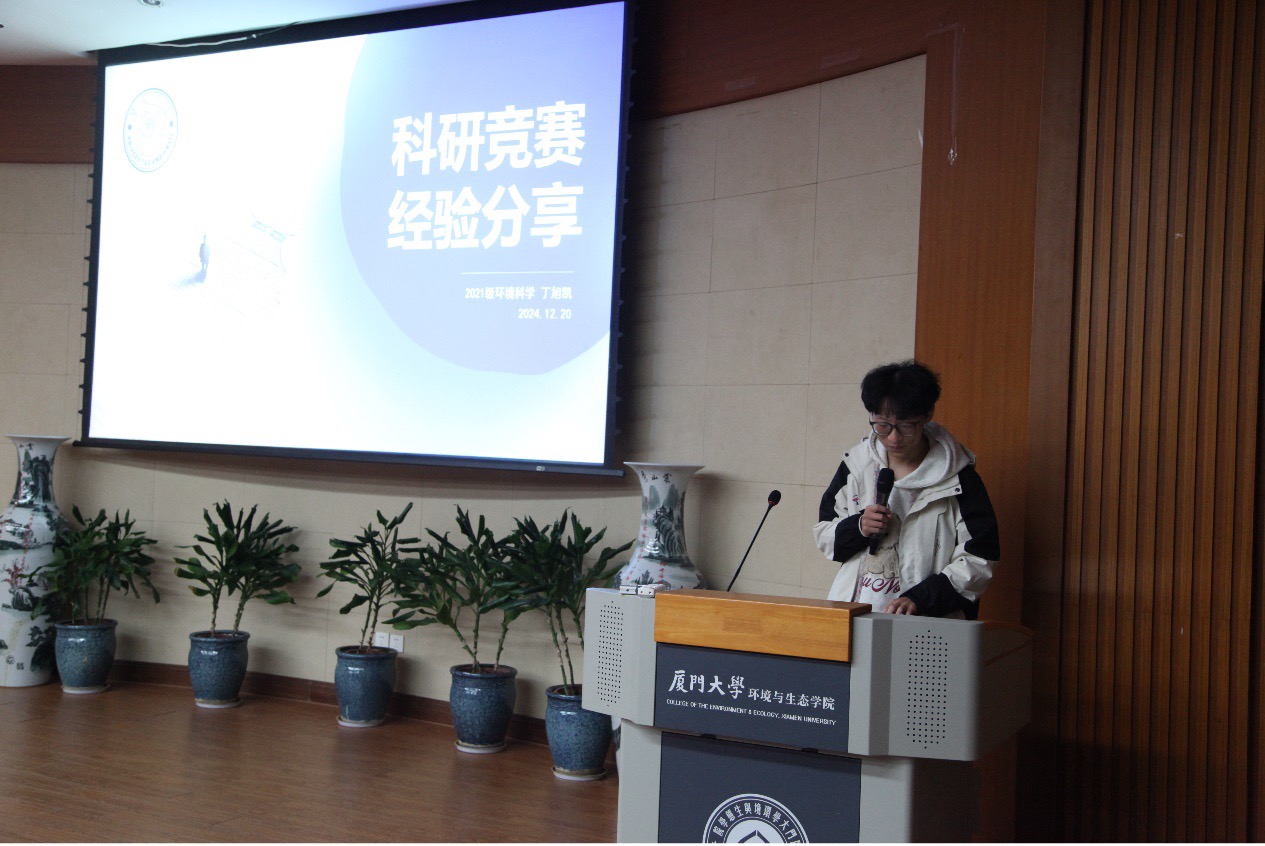 首先上台分享的是2021级环境科学专业的丁旭凯同学。他讲述了自己的科研竞赛经历,详细地介绍了进行科研训练的实际操作步骤以及分享了学业竞赛的相关经历。他的分享引发同学们对于接下来如何参与科研竞赛的思考,他建议同学们多方面了解相关信息,在科研训练以及学业竞赛中不断拓宽眼界,提升自己的综合实力。