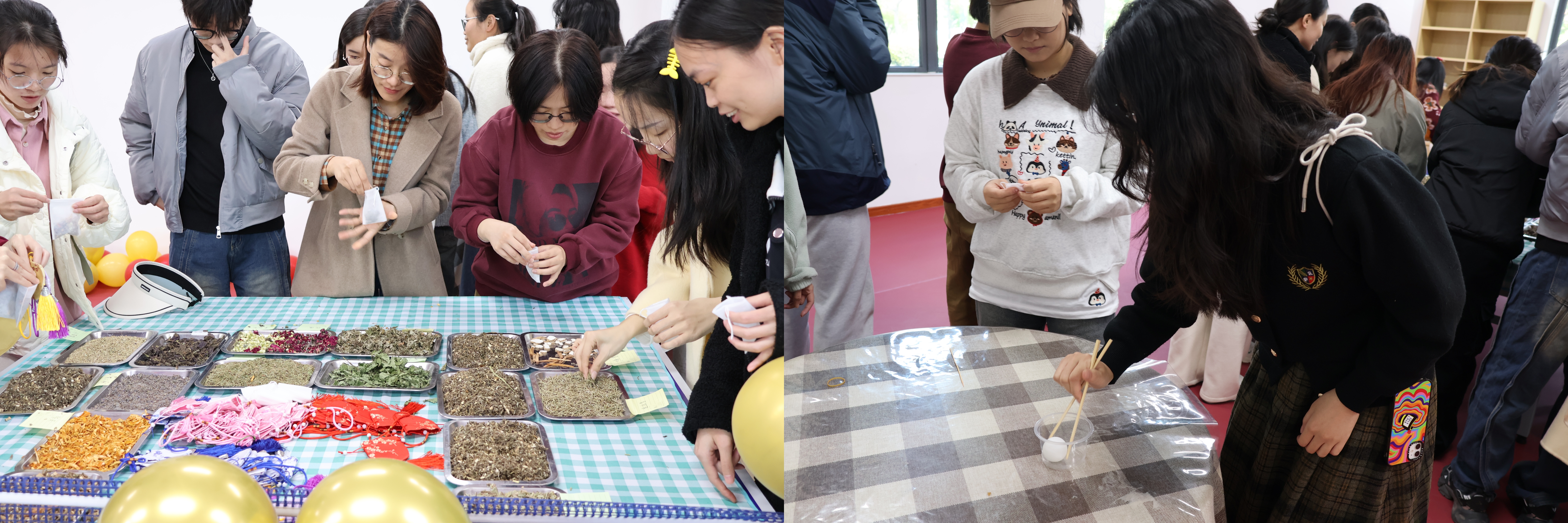 活动当天,现场气氛热烈,欢声笑语不断。活动设置了“入场游戏”和“美食盛宴”两个环节。师生们需要先参与制作香囊或夹乒乓球游戏,获得一场美食入场券。