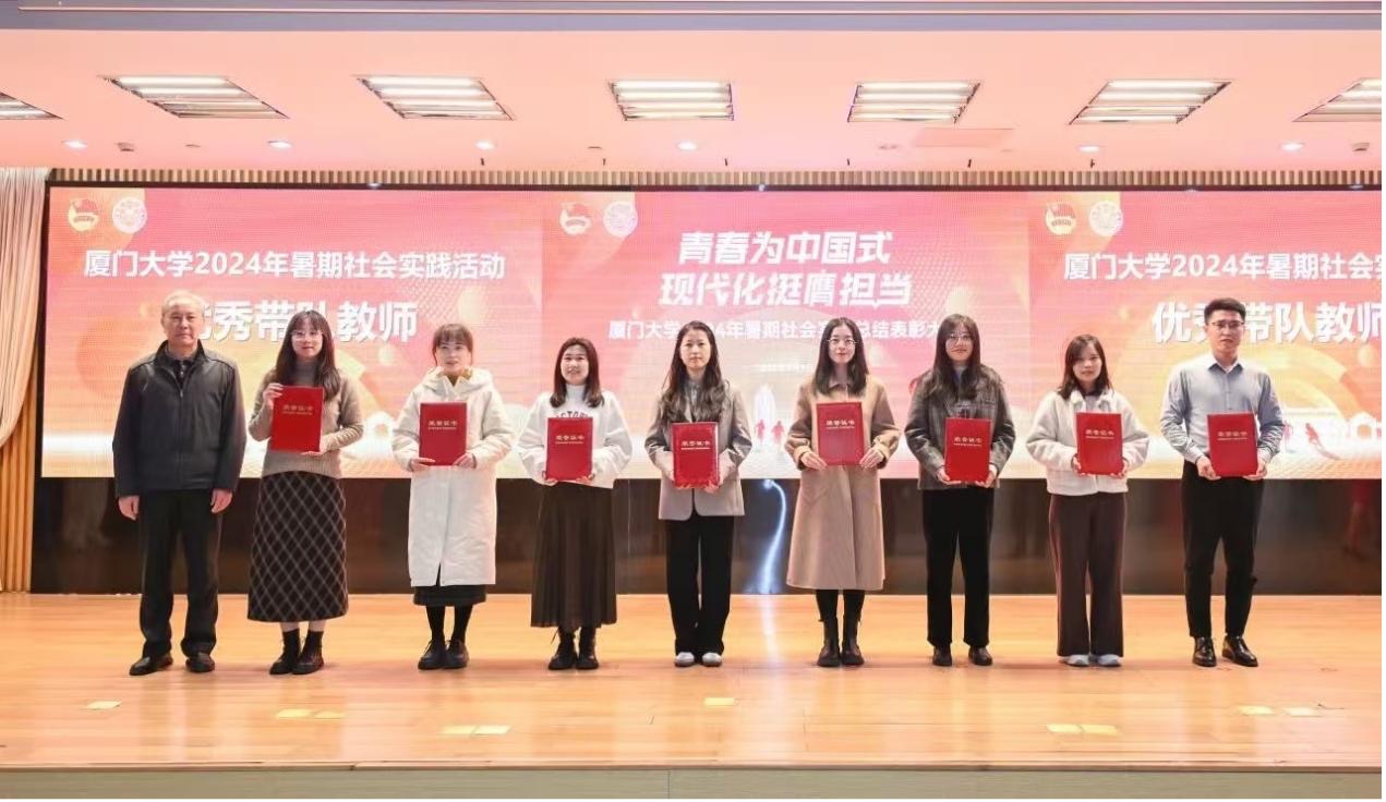 1月9日下午,学校在科艺中心多功能厅召开2024年暑期社会实践总结表彰大会。会上,我院“寻八闽红树路·守蓝碳生态情”暑期社会实践队获评“2024年厦门大学暑期‘三下乡’社会实践活动优秀团队”,陈能汪、王文卿、朱旭东、张雅棉、肖莉君五名老师获评“优秀带队教师”,王培洪、邓益娟、刘彦婕、宋佳悦、嵇乾威、陈江如、董事七名同学获评“社会实践积极分子”,《寻八闽红树路·守蓝碳生态情》调研报告获评“优秀调研报告”表彰。