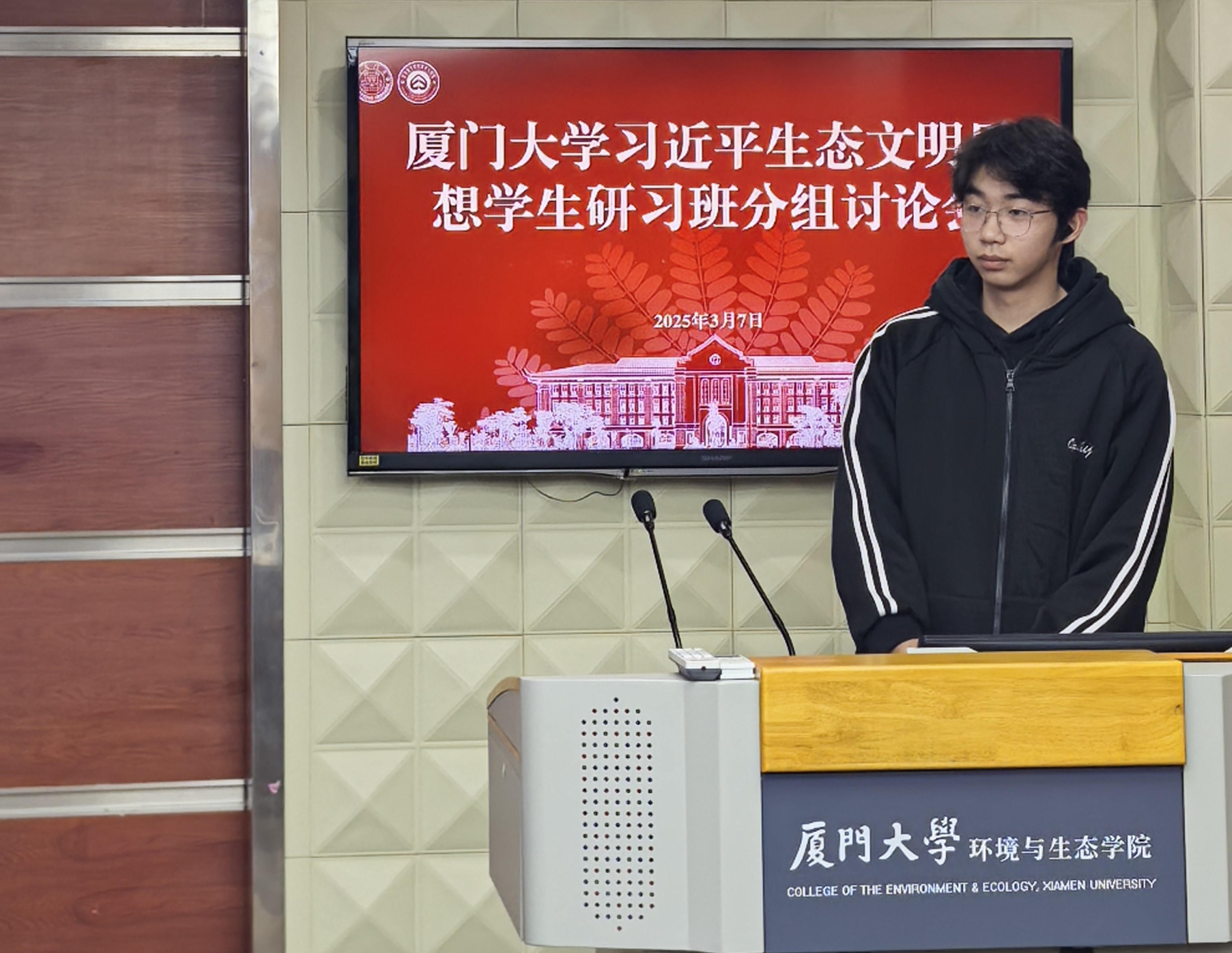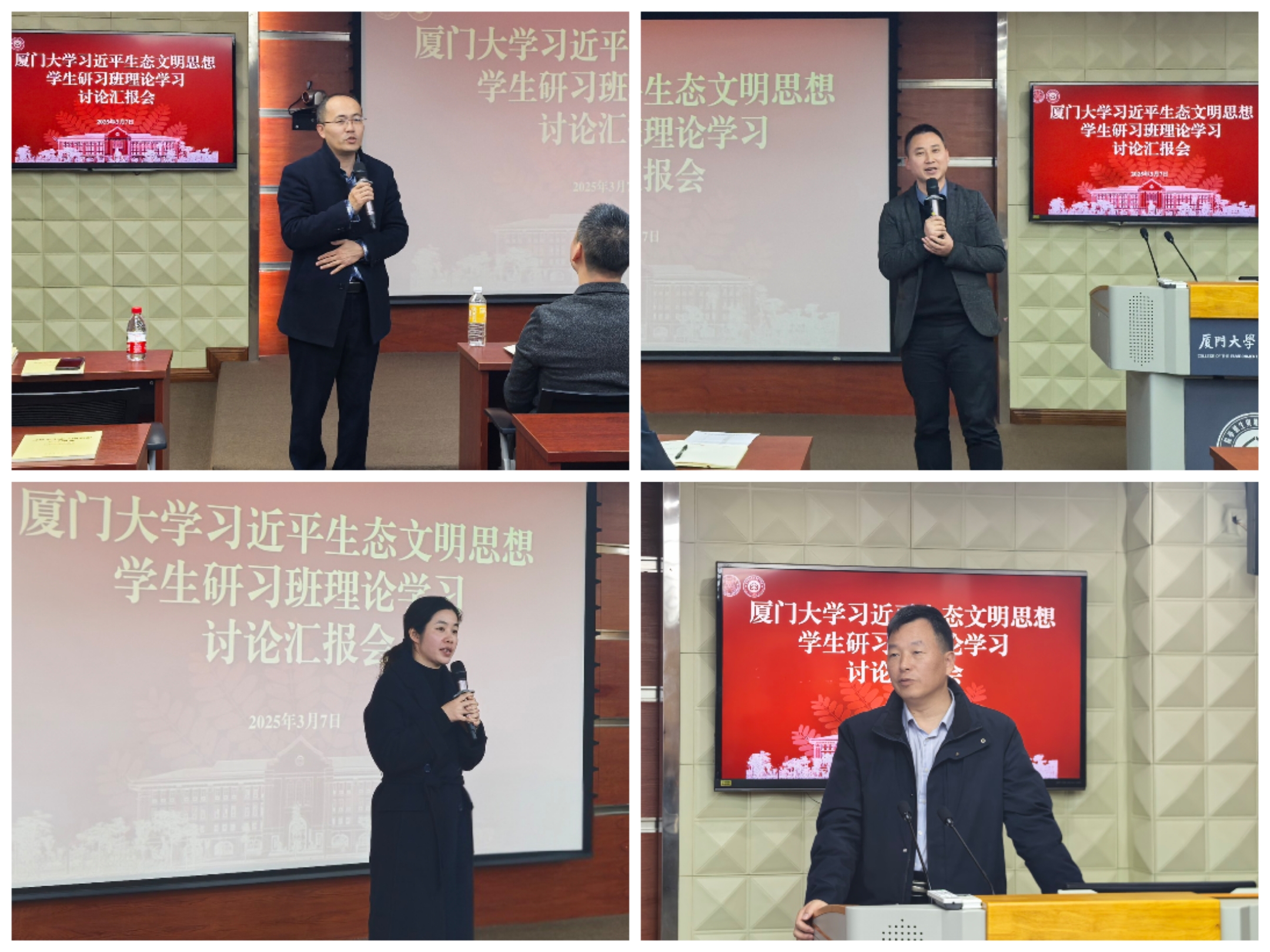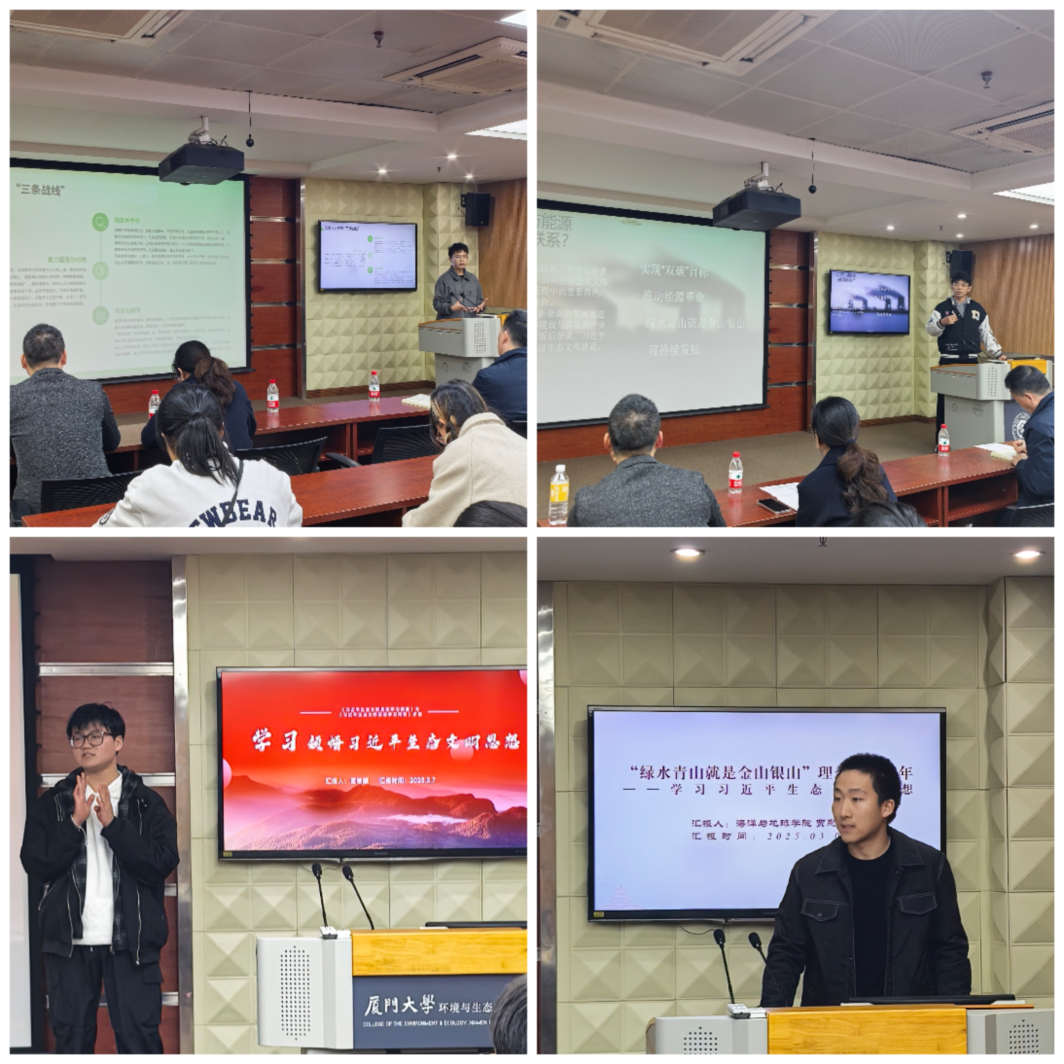 为进一步提升研习班学员政治理论水平,强化思想价值引领,推动习近平生态文明思想入脑入心入行,3月7日中午,厦门大学习近平生态文明思想学生研习班理论学习讨论汇报会在环境与生态学院金泉楼A239会议室举行。环境与生态学院党委副书记蔡虎堂、能源学院党委副书记赖炜芳、环境与生态学院团委书记曹京柱、能源学院团委书记于正伟出席活动。活动由研习班团支书董自成同学主持。
