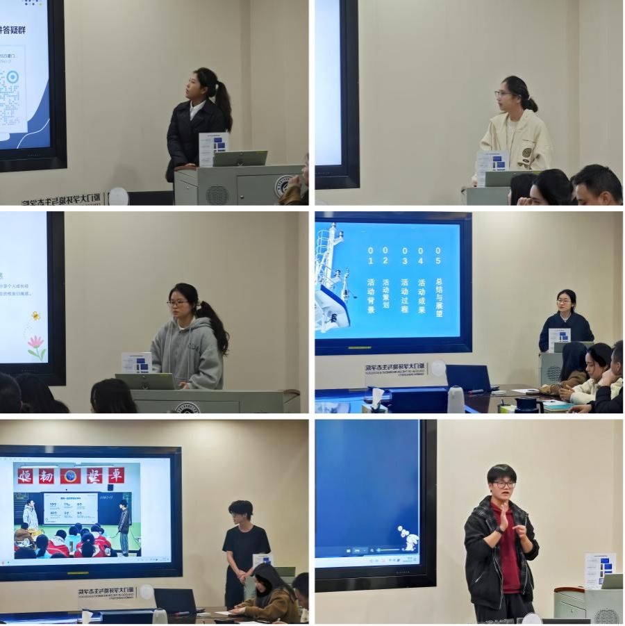 每支队伍的代表依次上台,通过图片和PPT展示等多种形式,向评委们展示其寒假招生宣讲实践过程中的精彩表现。在宣讲工作的准备阶段,他们进行了发宣传单、张贴宣传海报、建立咨询群以及录制高考加油视频等工作;正式的返校宣讲活动在线上和线下同时展开,包括线上直播和线下开展交流会议等多种方式,向母校的学弟学妹们详细介绍了厦门大学的整体概况和招生政策;同时,他们还通过自制厦门大学相关周边、制作厦门大学校园实拍视频等创意方式,向学弟学妹们展示厦大的独特魅力。