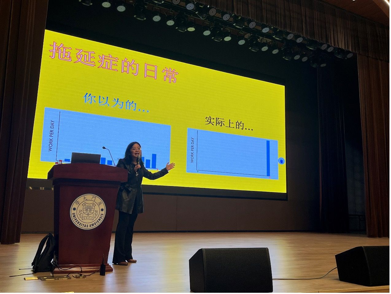 讲座伊始,祝婧媛指出,拖延症并非医学定义的心理疾病或精神障碍,而是一种明知有害却难以自控的非理性行为。通过生活实例解析,她系统阐述了导致拖延的多元因素:从外部环境看,任务周期长、难度大、反馈模糊等特征易引发拖延;从内在心理机制分析,完美主义倾向、过度责任感、决策焦虑及隐性反抗等心理因素往往加剧拖延行为。祝婧媛还从生理层面指出,由于人类大脑前额叶发育滞后于情绪本能系统,追求短期享乐而难以坚持长期规划是普遍存在的生物特性。总之,适度调整计划的拖延属正常现象,但当拖延导致效率下降、情绪困扰甚至影响心理健康时,则需及时干预。