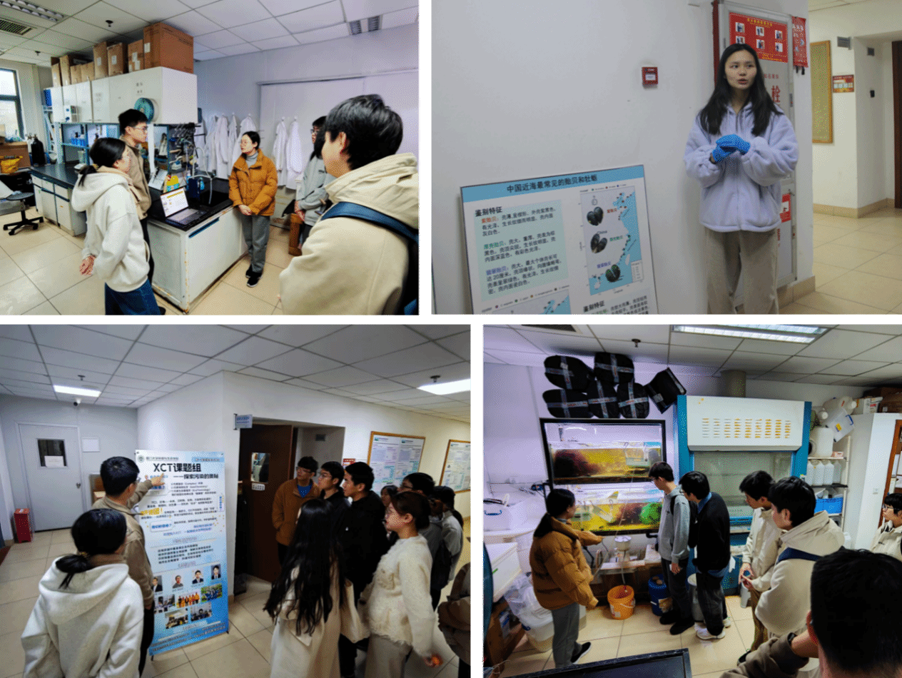 活动根据各课题组的研究方向和团队特点,分别设计了内容展板,方便课题组团队开展现场讲解。活动还将各实验室的研究方向与本科生核心课程进行对应匹配,帮助本科生系统梳理生态学与环境科学的知识体系。在XCT课题组,本科生们分组参与了微型科研项目,通过观察不同金属元素暴露条件下贝类生物的特征,进一步深化对“海洋环境质量生物监测”的理解。这种沉浸式体验让2023级环境科学专业本科生龙澜兴奋地说:“《环境化学》课本上的理论突然活起来了!”