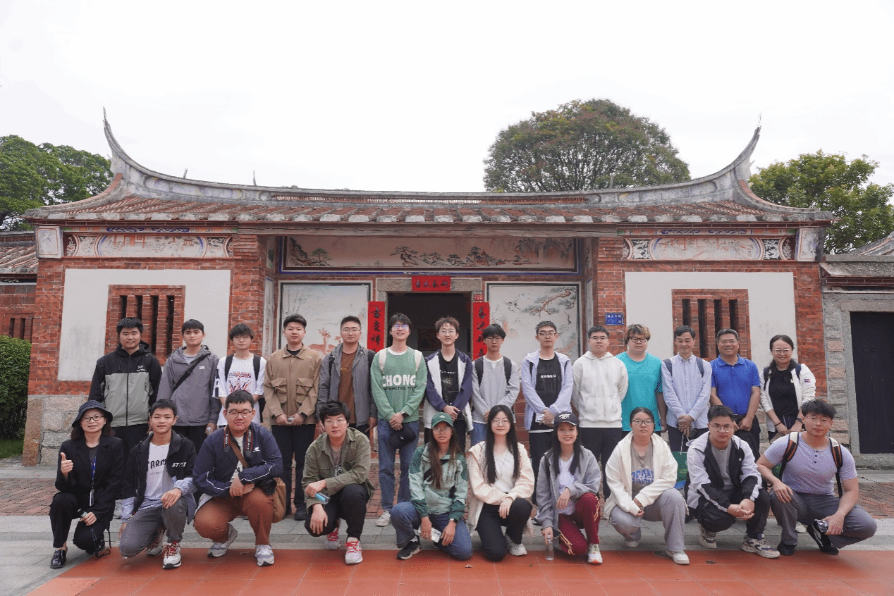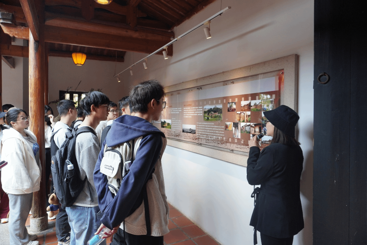 活动尾声,林丽松带师生们踏入了友达现代厂区内的闽南聚落——山头村,这里以“原迹、原样、原位”的理念完整保留着历史原貌。一踏入村口,那面布满鱼鳞状图案的花岗岩墙便映入眼帘,林丽松为师生们细细解读每一处古厝背后的故事,让师生们得以窥见闽南地区百年的沧桑变迁与文化传承。厅堂内,陈列着各式各样的农业器具;厅堂两侧的厢房里,影像记录将山头村的往昔一一呈现; 一侧厢房里所展示的多尊风狮爷,造型不同,却承载着闽南人对平安、招财等朴素信仰。