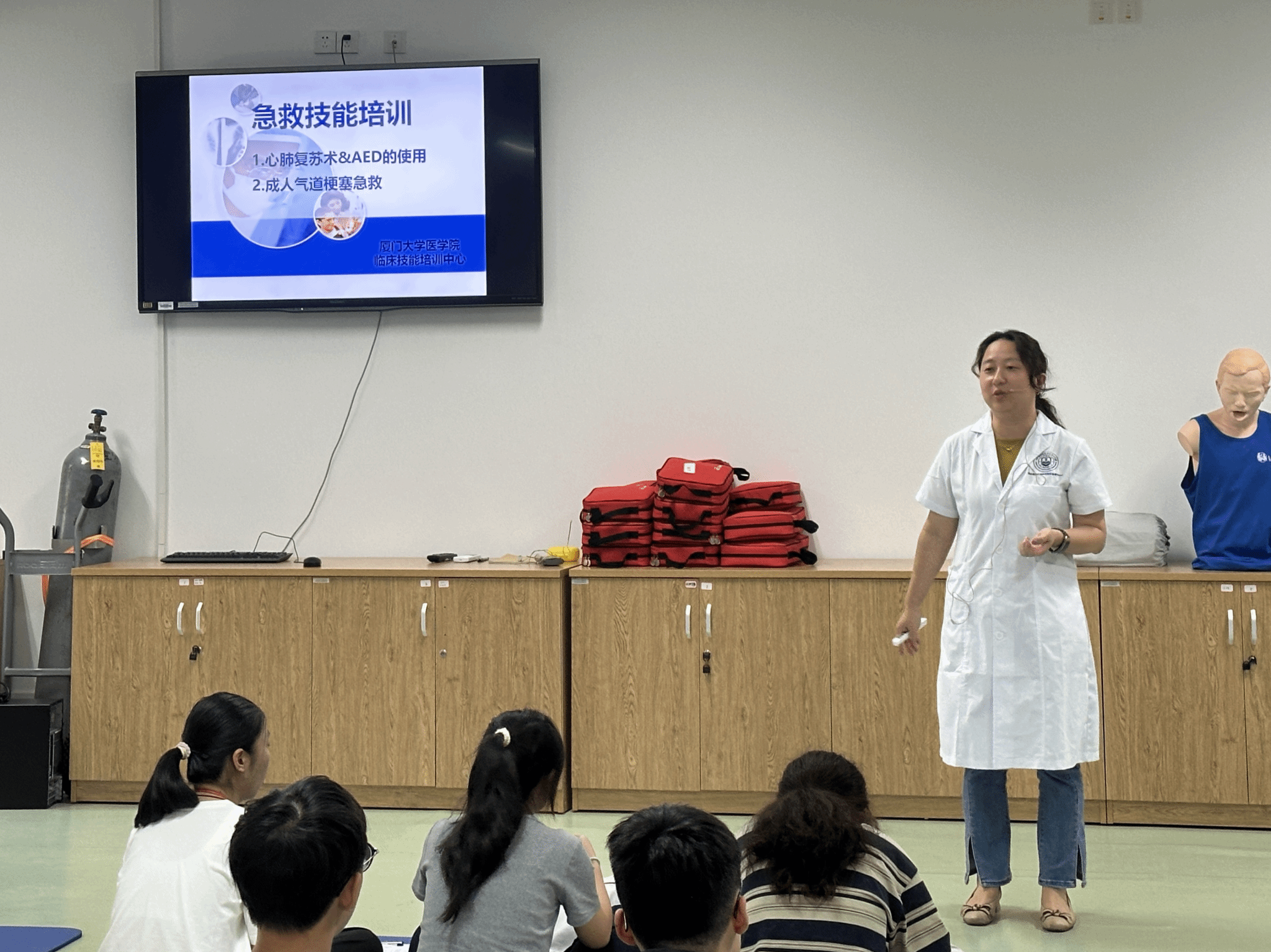 为进一步普及应急救护知识,提高同学们的自救互救与应急处置能力,4月29日中午,学院在翔安校区5号楼组织开展一场急救技能培训。来自厦门大学医学院临床技能培训中心的三名老师进行现场指导,学院50余名学生参加本次培训。