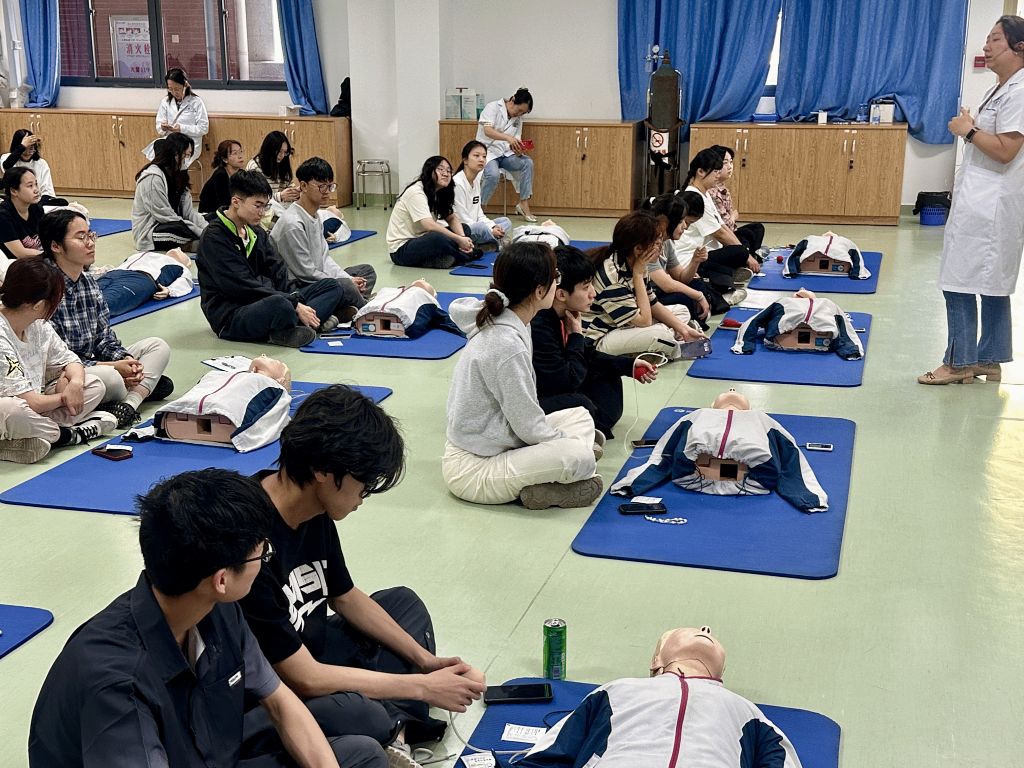 培训现场,老师先对心肺复苏术(CPR)进行深入讲解,阐明了其重要性及操作流程。从严谨的现场安全评估、精准的意识判断,再到胸外按压深度与频率的精妙把控,老师一一演示实际操作,并强调了其操作要点。在老师的指导和安排下,同学们分组在人体模型上进行了心肺复苏术实操练习,通过模拟场景演练深化了技能掌握。