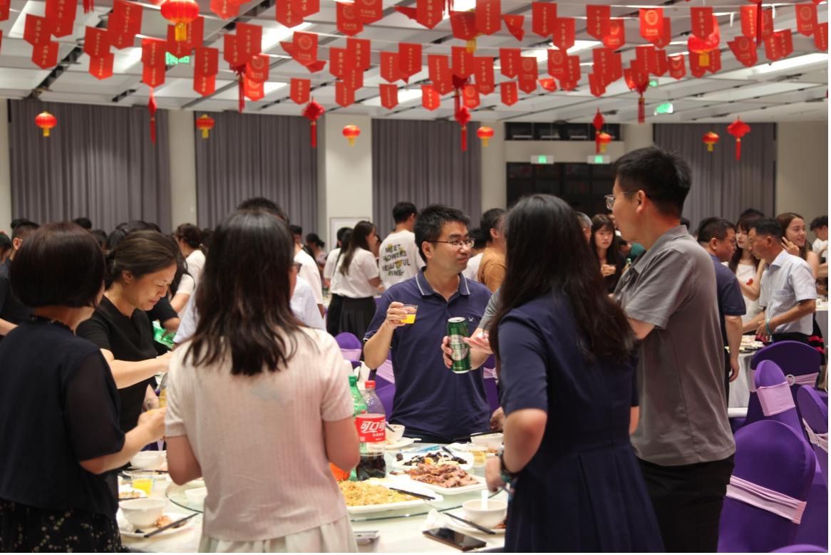 在祝酒互动环节,师生们纷纷起身,举起手中的酒杯,在璀璨的灯光下构成一幅温暖的画面。