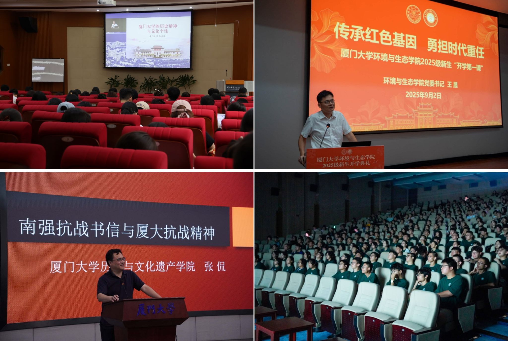 组织聆听朱水涌教授主讲思政大课《厦门大学的历史精神与文化个性》,阐释嘉庚精神与厦大文化的深厚渊源,让新生们深刻理解“自强不息,止于至善”的校训背后蕴含的“爱国、革命、自强、科学”厦大优良校风。学院党委书记王晟在新生“开学第一课”《传承红色基因,勇担时代重任》上,围绕“爱党、爱国、爱校”三大主题,深情寄语新生坚定理想信念、树立报国志向、勇担时代重任,主动将个人成长融入国家和时代发展,在中国式现代化建设中挺膺担当。学院邀请历史与文化遗传学院院长张侃教授带来《南强抗战书信与厦大抗战精神》专题讲座。张侃以抗战时期一批珍贵的往来书信为切入点,生动讲述了烽火连天岁月中厦大人坚守理想、心系民族命运的感人故事,勉励在场新生要铭记历史,自觉弘扬和传承伟大的抗战精神,立志成为心怀“国之大者”的栋梁之才。学院还组织全体本研新生集体观看了电影《南京照相馆》,接受最直观最深刻的爱国主义教育。